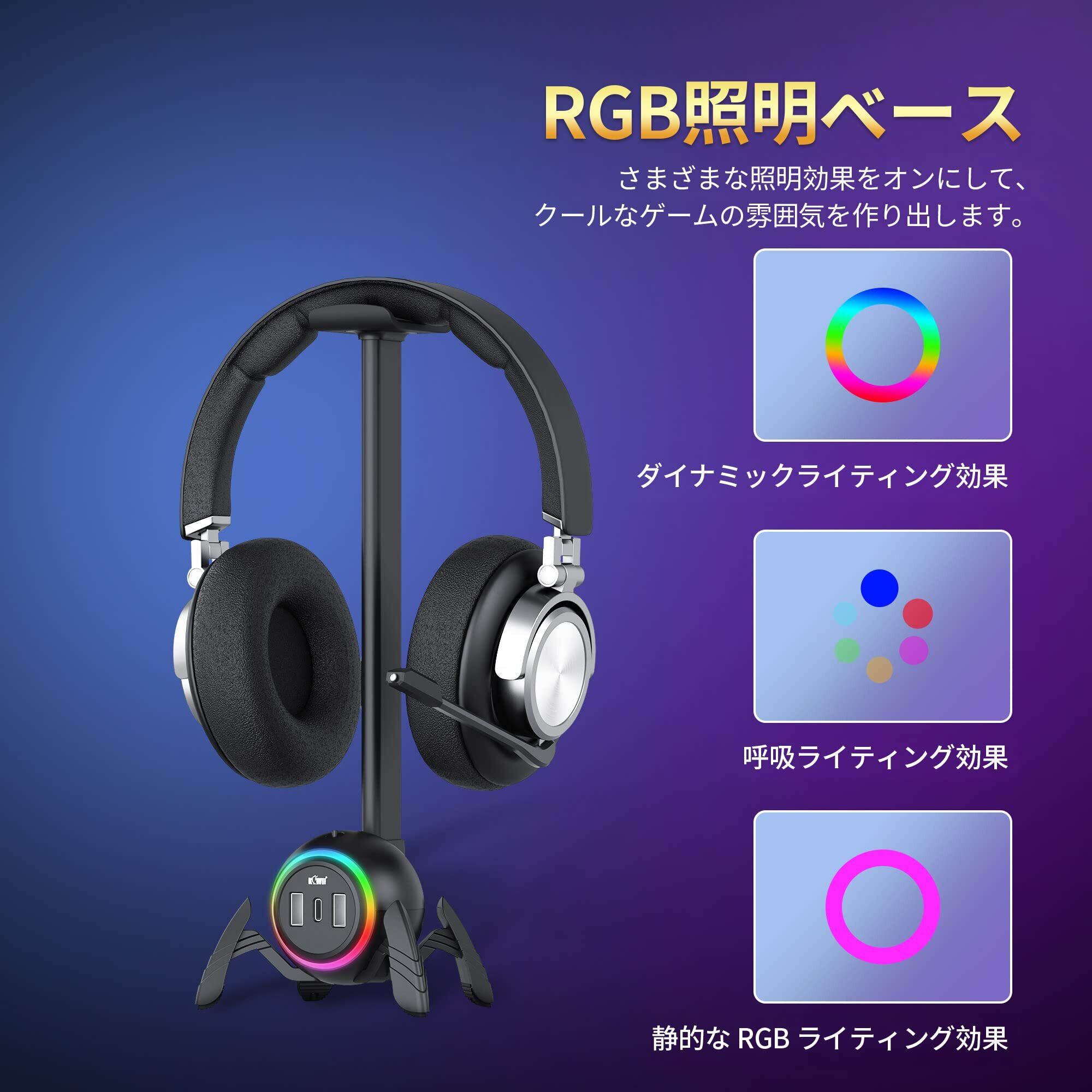 KIWIFOTOS 卓上 ヘッドホンスタンド RGBライト ヘッドセットスタンド 組み立て簡単 内蔵USBハブが付き 2つのUSB 2.0 ポートと1つのType-C ポート データ伝送 充電不可 ゲームアクセサリー PCデスク装飾 ブラック | kki