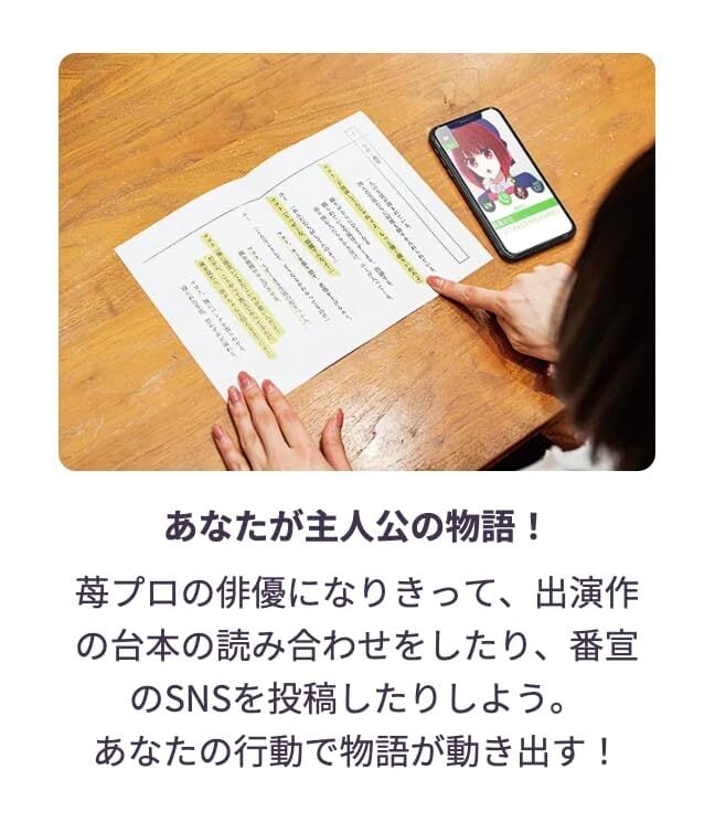あなたが主人公の物語! 苺プロの俳優になりきって、出演作の台本の読み合わせをしたり、番宣のSNSを投稿したりしよう。 あなたの行動で物語が動き出す!