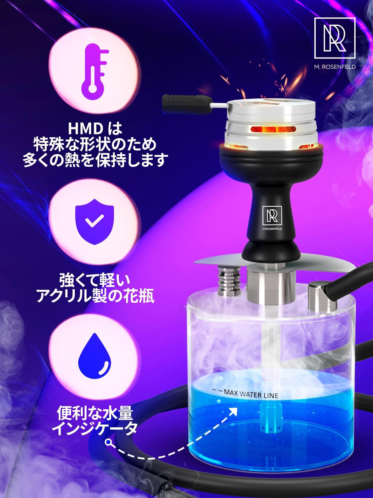 必要なコンポーネントがすべて揃ったフルフッカセット。飛散防止アクリルボウル、ディフューザー搭載ステンレスステム、ソフトタッチシリコンホース、2分割アルミマウスピース、フッカトング、HOOKARTIS熱管理デバイス付きブラッククレイボウルを同梱し、到着当日からプロ品質の煙とフレーバーを楽しめます。キャリーバッグ付属で収納も簡単、工具不要のクイック組立で初心者も安心。コンパクト設計ながら耐久性も高い