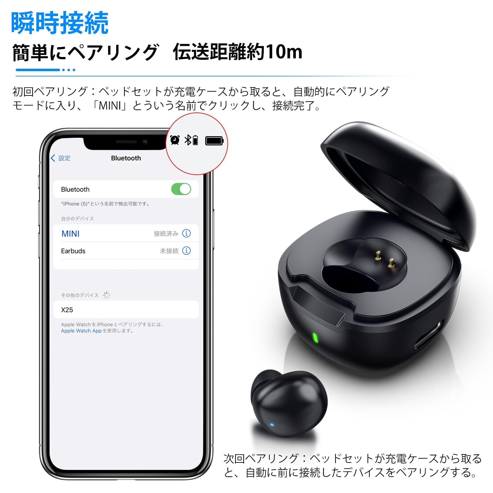 【V5.1高品質Bluetoothヘッドセット】Bluetooth 5.1真のワイヤレスイヤホン、ブロードキャスト通信容量が8倍に増やし、信号が強くなり、接続範囲は10m程高く、高速で安定の接続体験が実感できます。優れたトランペットとオーディオ部品を搭載し、CVCノイズリダクション技術を採用し、ノイズを抑え、HIFI音質と高品質の音とクリア通話を実現します。V5.1でデバイスへの互換性も広く、スマホ、タブレット、ラップトップ等Bluetooth機能搭載のデバイスに適用します。