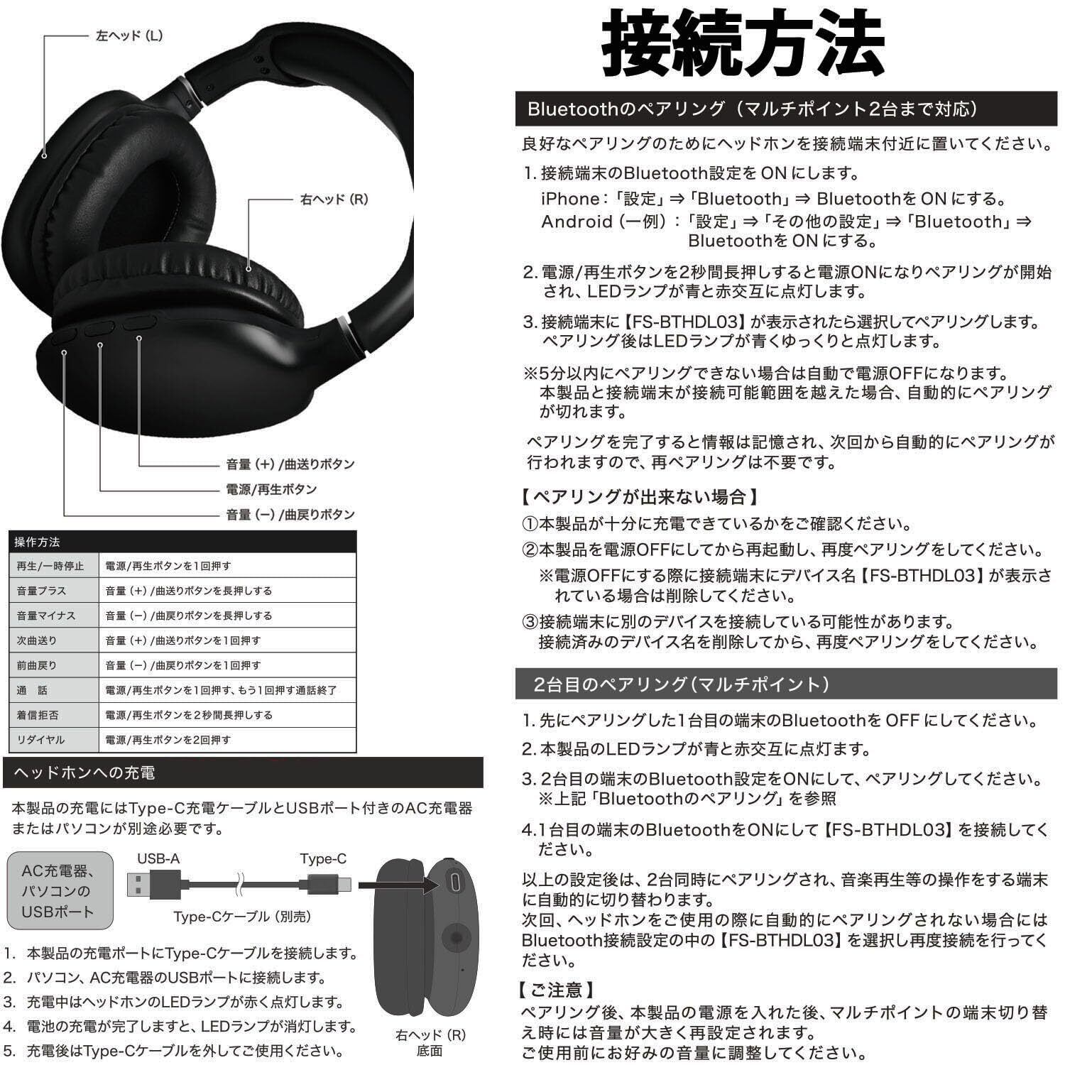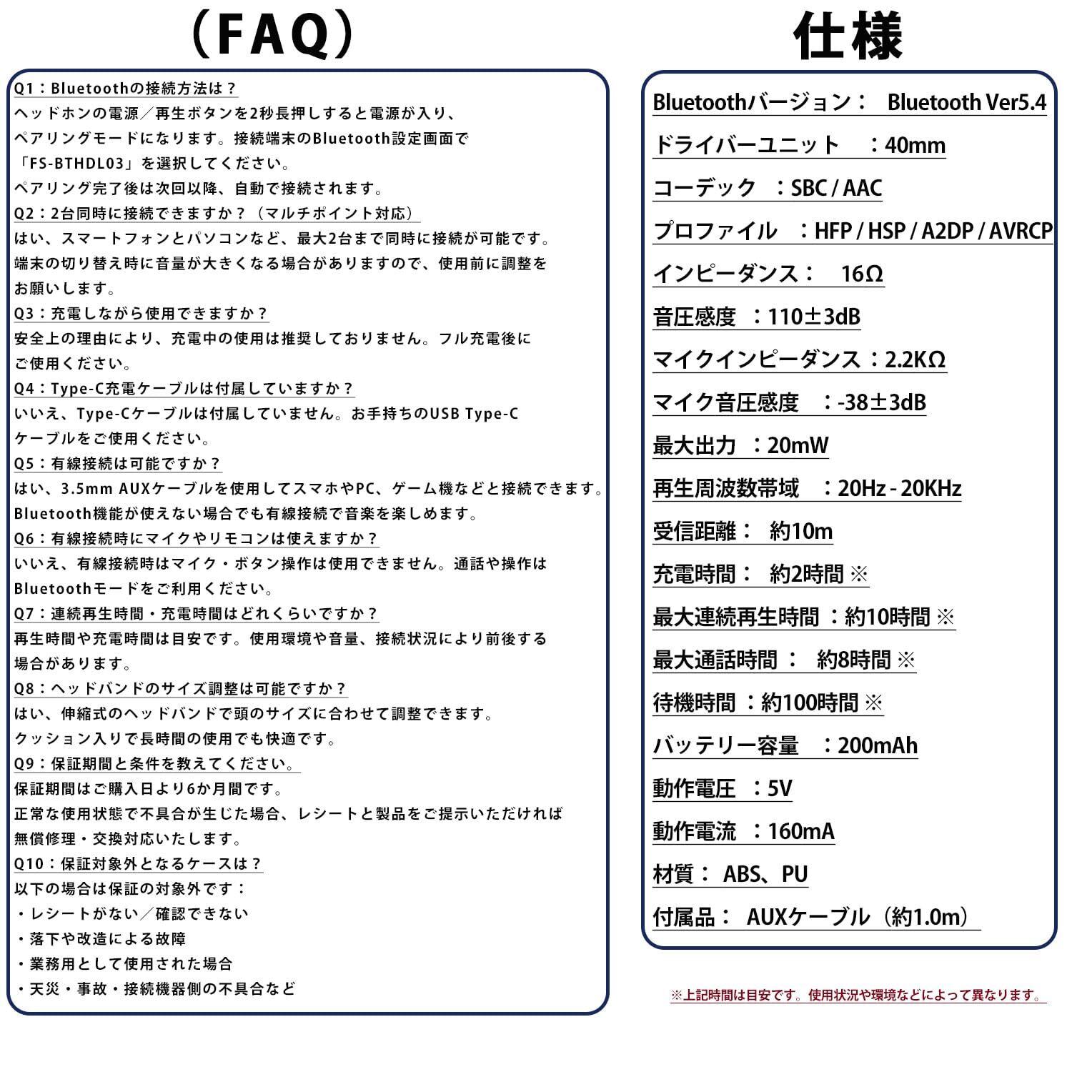 Bluetooth5.4 ヘッドセット FS-BTHDL03-BK 有線・無線 両対応 ヘッドホン 40mmドライバー マイク内蔵 折りたたみ式 軽量 長時間バッテリー AAC対応 テレワーク 通話 音楽用