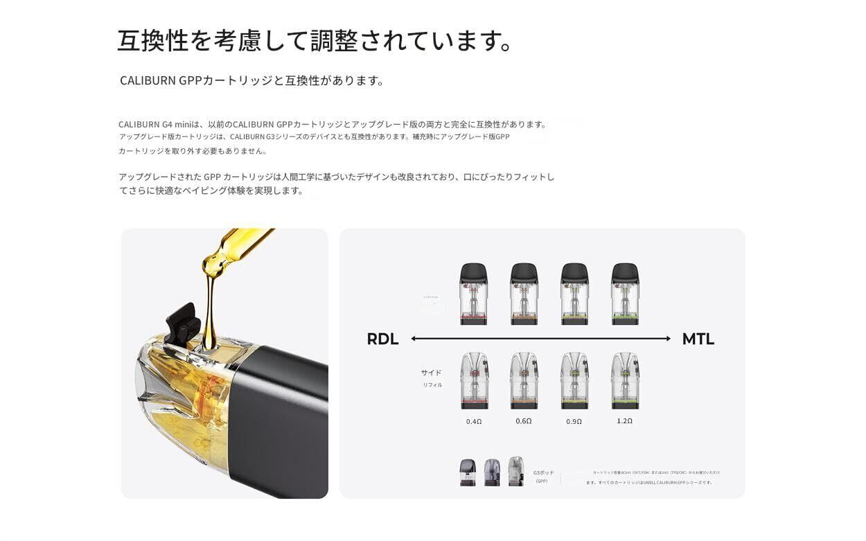 コンパクトなのに高性能。あなたのポケットに、極上のフレーバーを。「Caliburn G4 Mini」が登場。Caliburn G4 Miniは、携帯性と味の満足感を両立させたポッド型デバイスです。 最新のPRO-FOCS 4.0テクノロジーにより、フレーバーの再現度が35%向上し、カートリッジの寿命も同じく35%長持ち。さらに、最大出力35Wの高性能設計で、しっかりとした吸いごたえを実現します。 スライド式のバルブとカートリッジの向きによるデュアルエアフロー調整機能により、吸い心地も自由自在。CALIBURN GPPシリーズのカートリッジと互換性があり、柔軟な運用が可能です。 ミニマルでスタイリッシュなデザインは持ち運びにも便利。日常使いから外出先まで、あらゆるシーンで活躍する1台です。