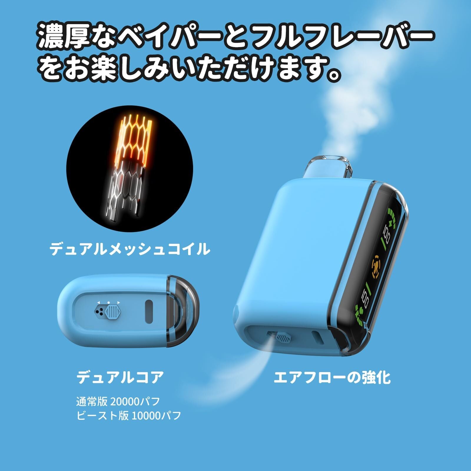 特徴 フルスクリーンディスプレイ,デュアルメッシュコイル,モード切替,長時間使用,軽量設計,ニコチンフリー