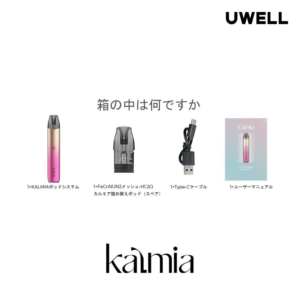 【内容品】: Uwell Kalmia ポッドシステムキット・1点。FeCrAl UN2メッシュ-H1.2ohmカルミア詰め替え可能ポッド(スペア)・1点。ユーザーズマニュアル・1点。Type-Cポート・1点。