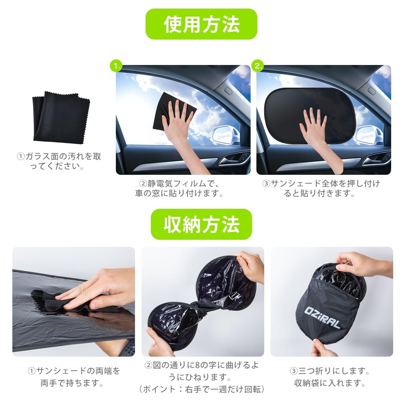 車用サンシェード サイド 車日よけ Oziral 車窓 静電気サンシェード 黒フィルム 遮光 日焼け防止 UVカット 断熱 目隠し 簡単着脱 紫外線カット 簡単取付 収納袋付き カーシェード 自動車対応 4枚セット