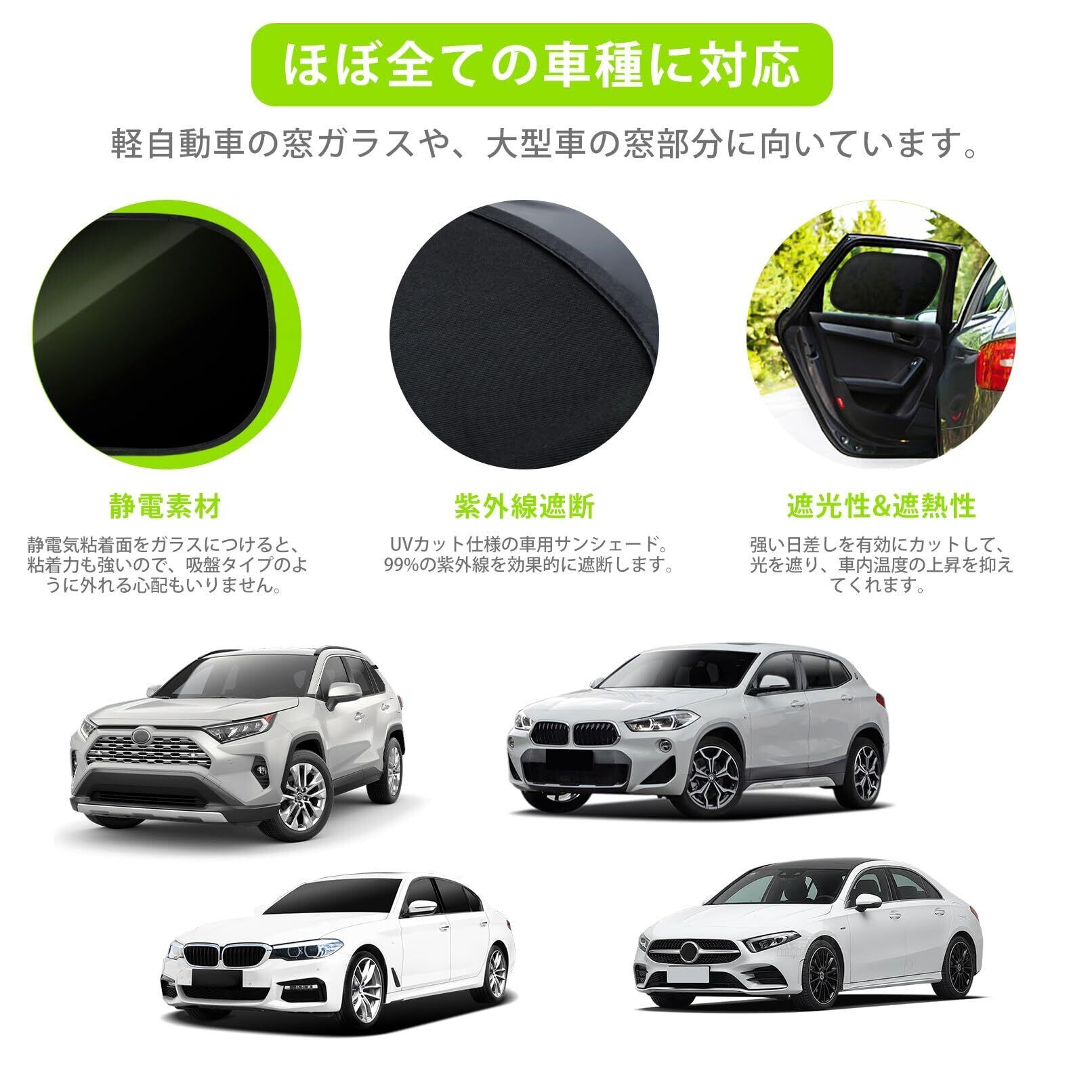 【遮光・断熱日除け対策効果で快適に】高密度メッシュ素材と黒色静電フィルムを使用して作られた、UVカット仕様の車用サンシェード。サイドや後部座席のガラスに付けることで光を遮り、車内温度の上昇を抑え、夏の炎天下でも快適な空間をキープ。99%以上のUVカット性能で、肌を日焼けから守りたいときにもぴったり。子供がいるご家庭にもおすすめ。