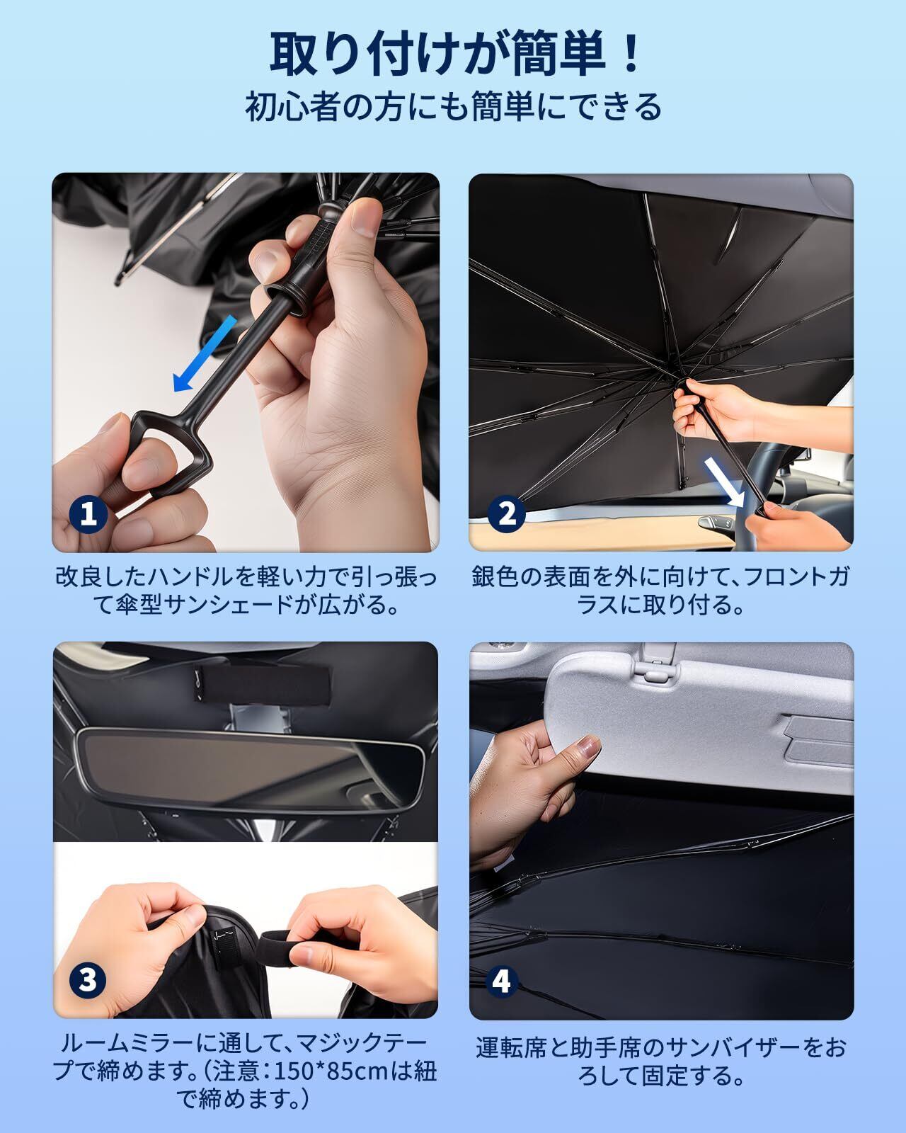 サンシェード 車 フロント 2025 車用サンシェード 360°折れる中棒 ガラス繊維10本骨 傘型サンシェード 折りたたみ式 バックミラー開き口 TPU中棒設計 内装を傷つけない 日除け カーシェード 窓 遮光 遮熱 UVカット 取付簡単 日焼け対策 車中泊 仮眠 暑さ対策 収納ポーチ付き 150*85cm