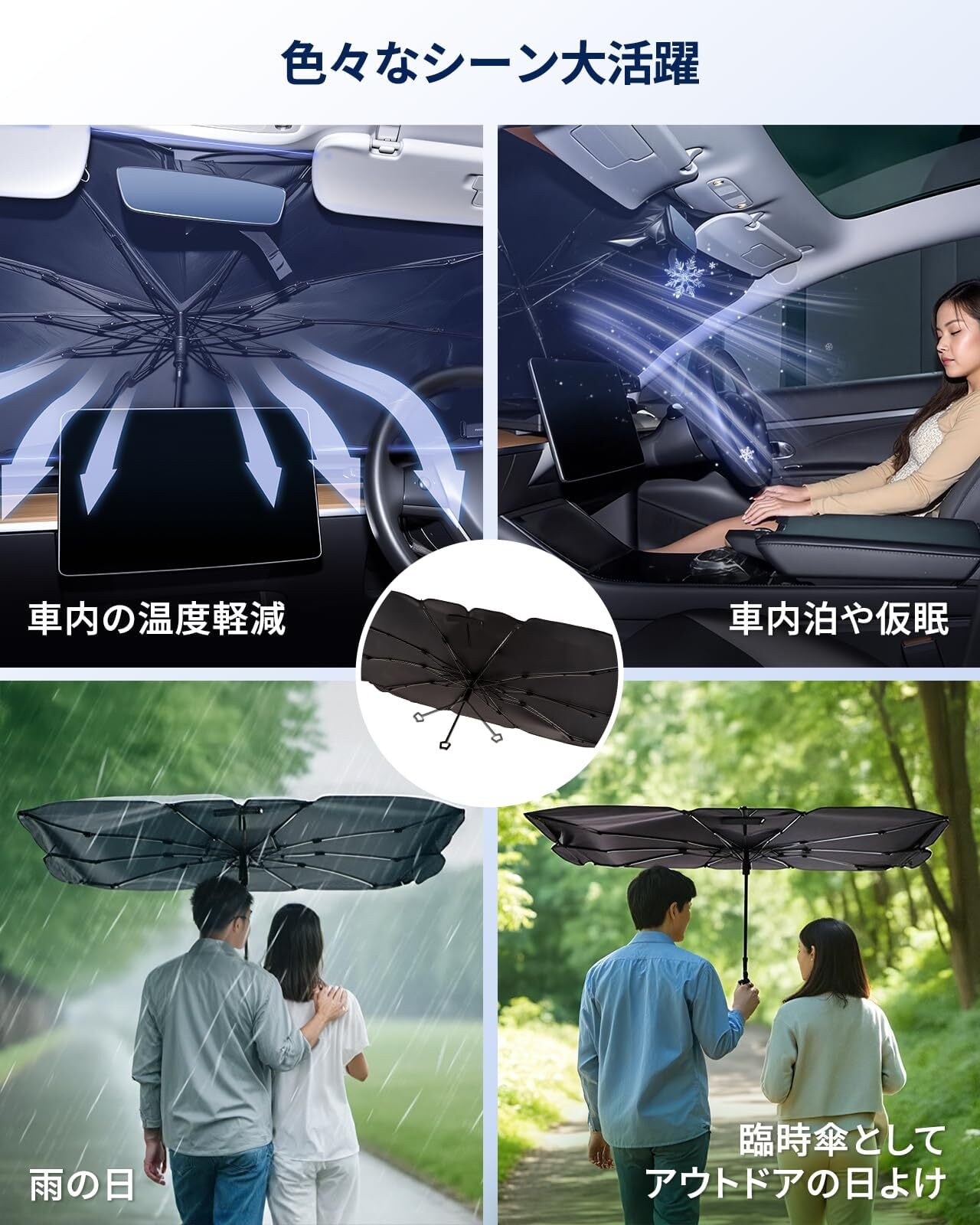 【傘式デザイン】傘の形をデザインした車用サンシェードです。二つの開口部があり、フロントミラーやドライブレコーダーを邪魔することなく車窓を完全にカバーできます。取り付けが不要で、パッと開いてフロントガラスに設置することができ、女性でも簡単に使えます。効果的に日光を遮り、車内を常に涼しく保ちます。