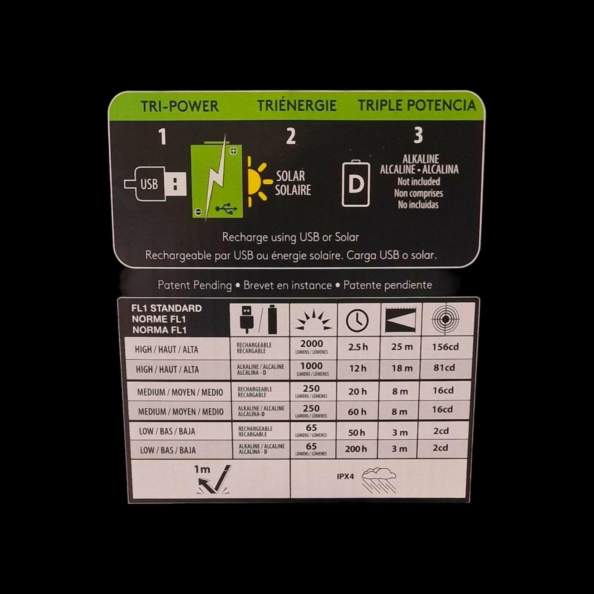 最大2000ルーメンで明るさは3段階で調節可能 キャンプや登山などのアウトドアから停電や災害などの非常時にも 使用シーンを選ばない防雨構造と1mの落下耐久 ソーラー充電内蔵リチウム電池乾電池USB充電・給電のハイブリッド電源方式を採用 USB充電式で繰り返し使用でき単1乾電池も併用することで長時間の使用が可能 電源のない環境でも充電できるソーラーパネル付き スマートフォンなどへの充電が可能なUSB出力ポート付き