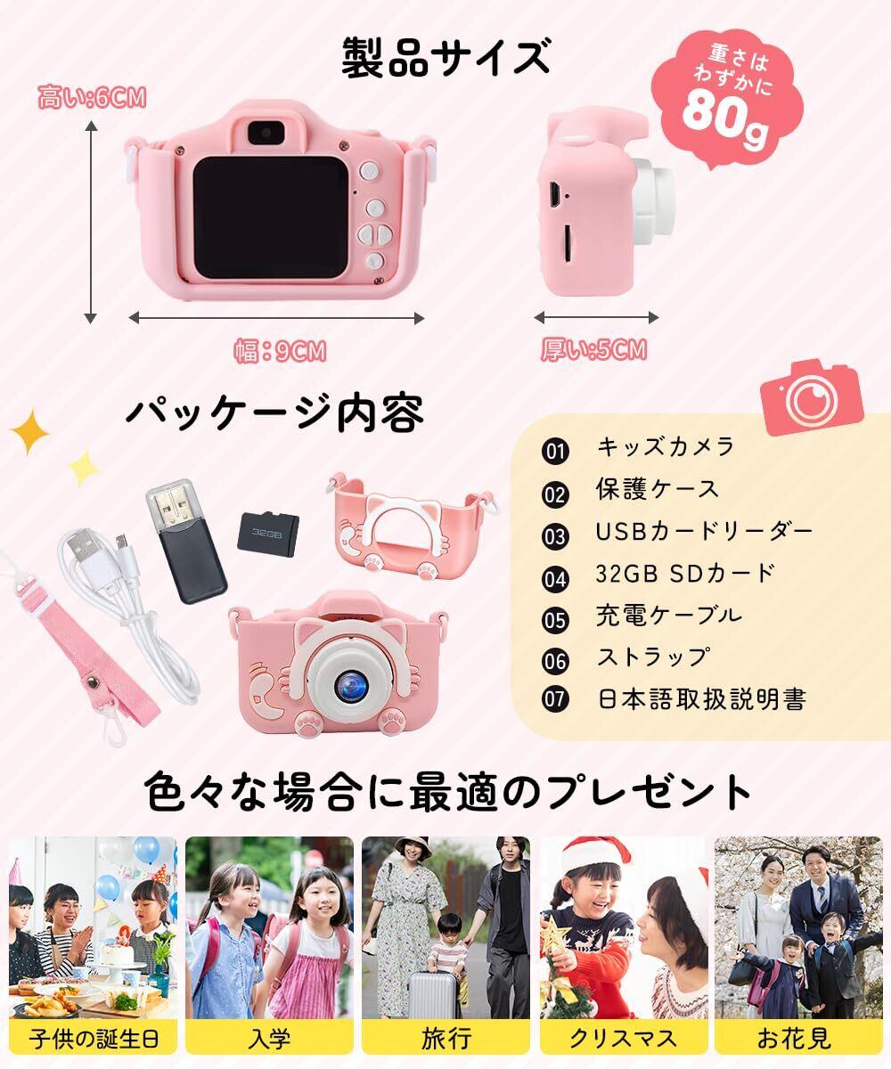 キッズカメラ 子供 カメラ トイカメラ 1080P HD 動画カメラ 32GB メモリーカード付き USB充電 2.0インチ IPS 画面 8倍ズーム 子供用カメラ 保護ケース デュアルレンズ 操作簡単 タイマー撮影 子供向け録音自撮り ゲーム機能 カメラデジタルカメラ4歳 5歳 6歳 キッズ 男の子 女の子 デジカメ 子供の日 誕生日 プレゼント 日本語説明書付き デジタルカメラ