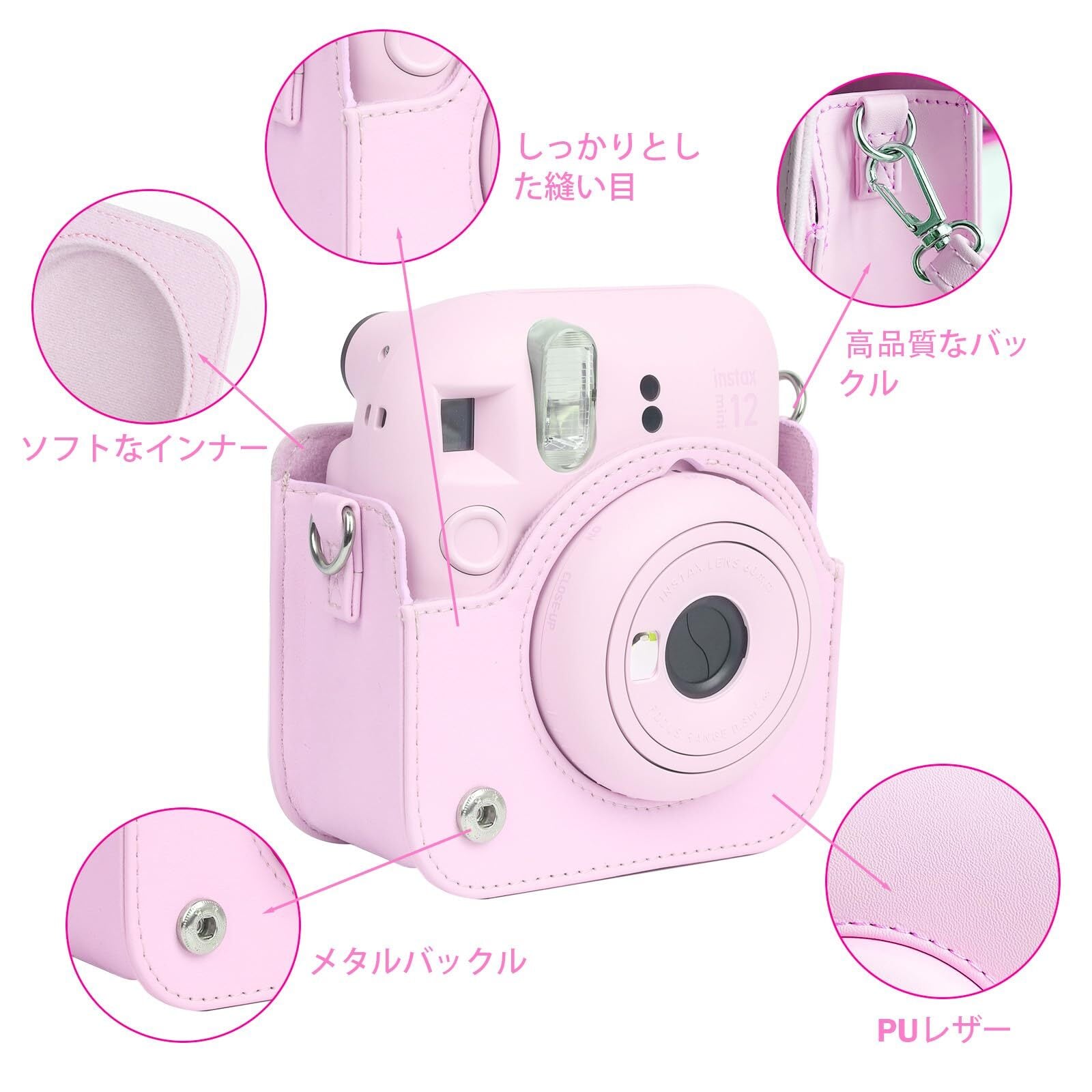 Easy Hood 富士フィルム FUJIFILM チェキ Instax Mini 12 インスタントカメラ用 PUレザー保護ケース Polaroid Mini 12用カメラケース スナップで開閉 着脱可能な保護スリーブ 調節可能なショルダーストラップ付き ピンク | kki