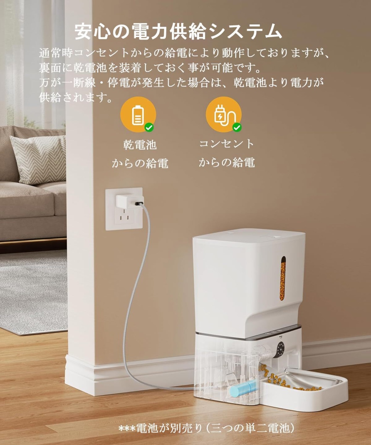 【大容量・スマホから自動餌やり】ほとんどのドライフードタイプの猫餌や犬餌に対応できる7L大容量。1日1-15回の自動給餌が可能。毎回1-10のポーションを設定でき、手動給餌もできる。ペットの食事量や食事時間を手軽に調整でき、アプリで給餌記録がメモされる。フード残量が不足してきたら、アプリでお知らせ。忙しい毎日でもペットの食事管理ができる。餌器のコントロールは家でも外でもOK。ペット猫・犬に即時手動給餌こと、毎日の食物量や回数を定時定量給餌に設定すること、前の餌やり記録、フードタンク中の餌足りないときのお知らせ、家族みんなでシェア、いろいろな便利な機能があります。