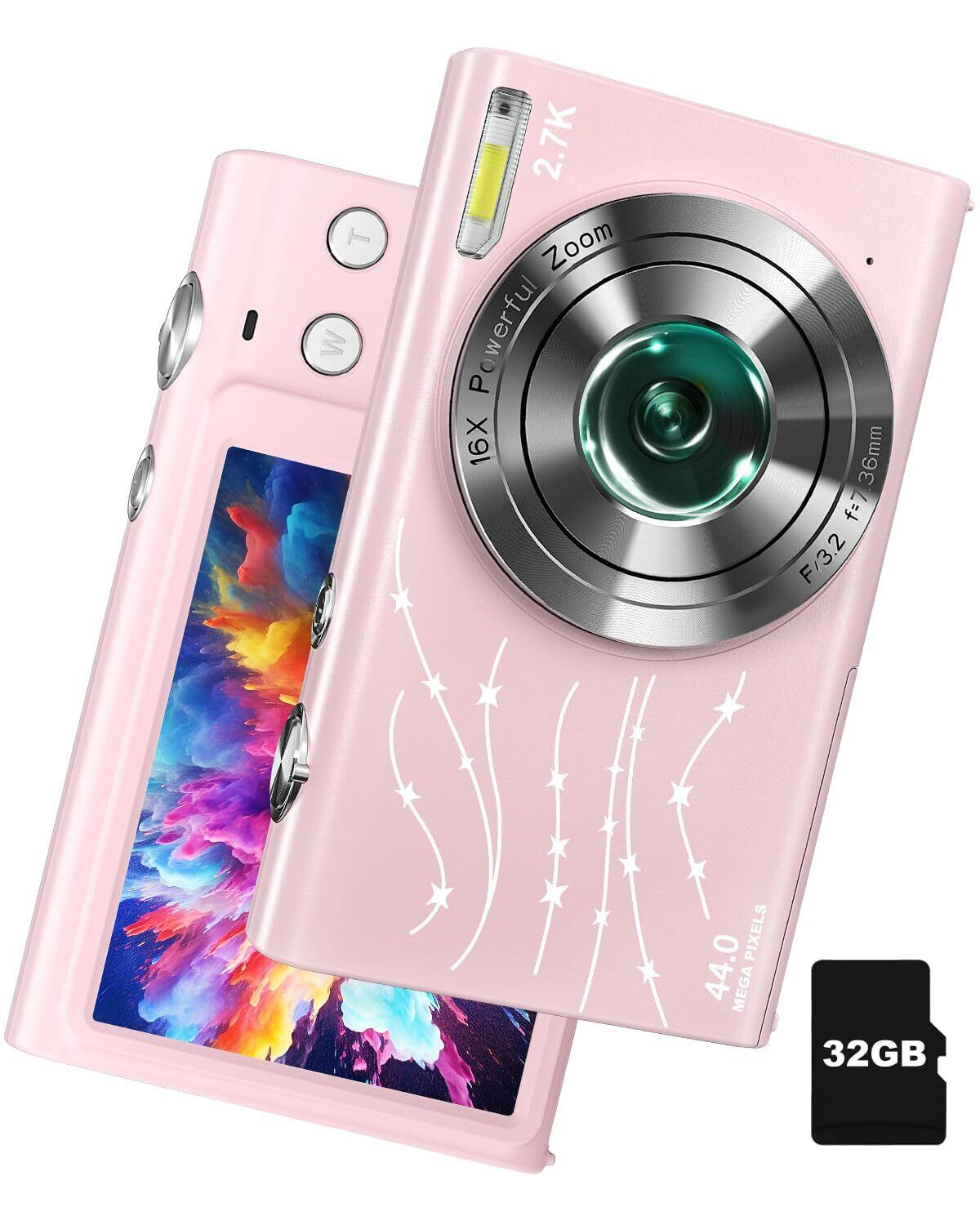 デジタルカメラ デジカメ 4400万画素 2.7K動画撮影 固定焦点 タイムラプス スローモーション 学生 修学旅行 子供利用可能 オートフォーカス 超軽量 初心者 セット 電池2個 32gカード付 ピンク | kki