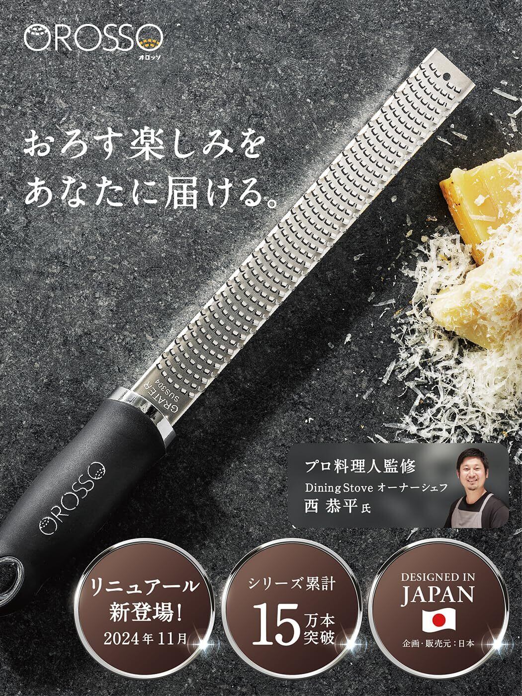 【2024年11月リニューアル!】 お客様の声を聞き、改良に改良を重ね、更におろしやすくなりました。 0.1mm単位で刃の角度を調整したこだわりのブレードは、ハードチーズ、生姜、ニンニク、チョコレート、柑橘類など、様々な食材に幅広くお使いいただけます。食材の魅力を最大限に引き出し、お料理の幅がグンと広がります。