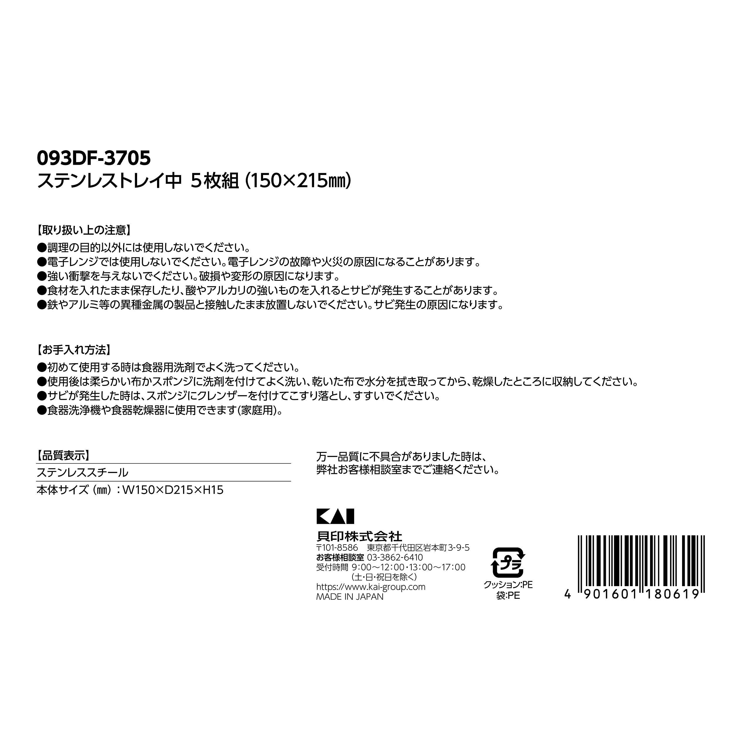 貝印 KAI ステンレス トレー バット 中 21.5 × 15 cm 5枚組 セット 093DF3705 日本製