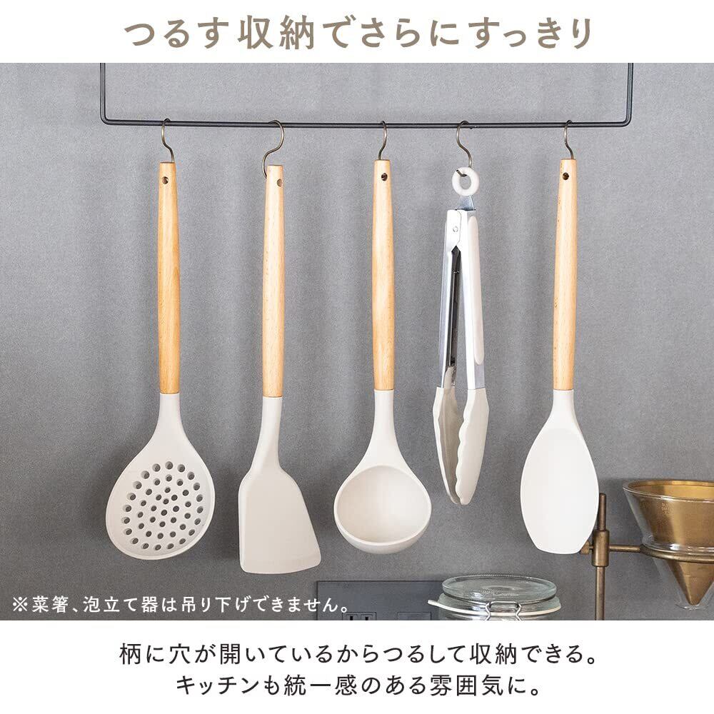 セット内容:フライ返し、お玉、スプーン深、スプーン浅、パスタシャベル、ヘラ、穴あきお玉、菜箸、トング、泡立て器、ハケ、ツールスタンド