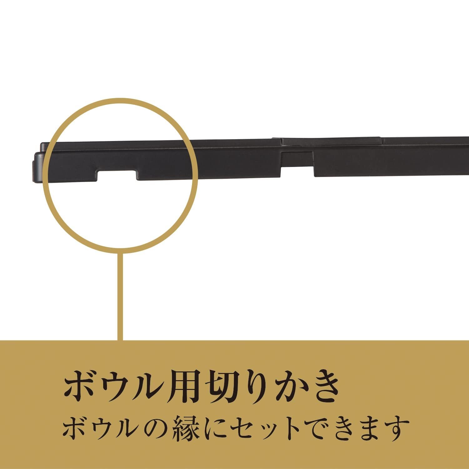 先を直置きして調理する時に滑りにくいように滑り止めと、ボールに載せて調理する時に安定する切り欠き付。