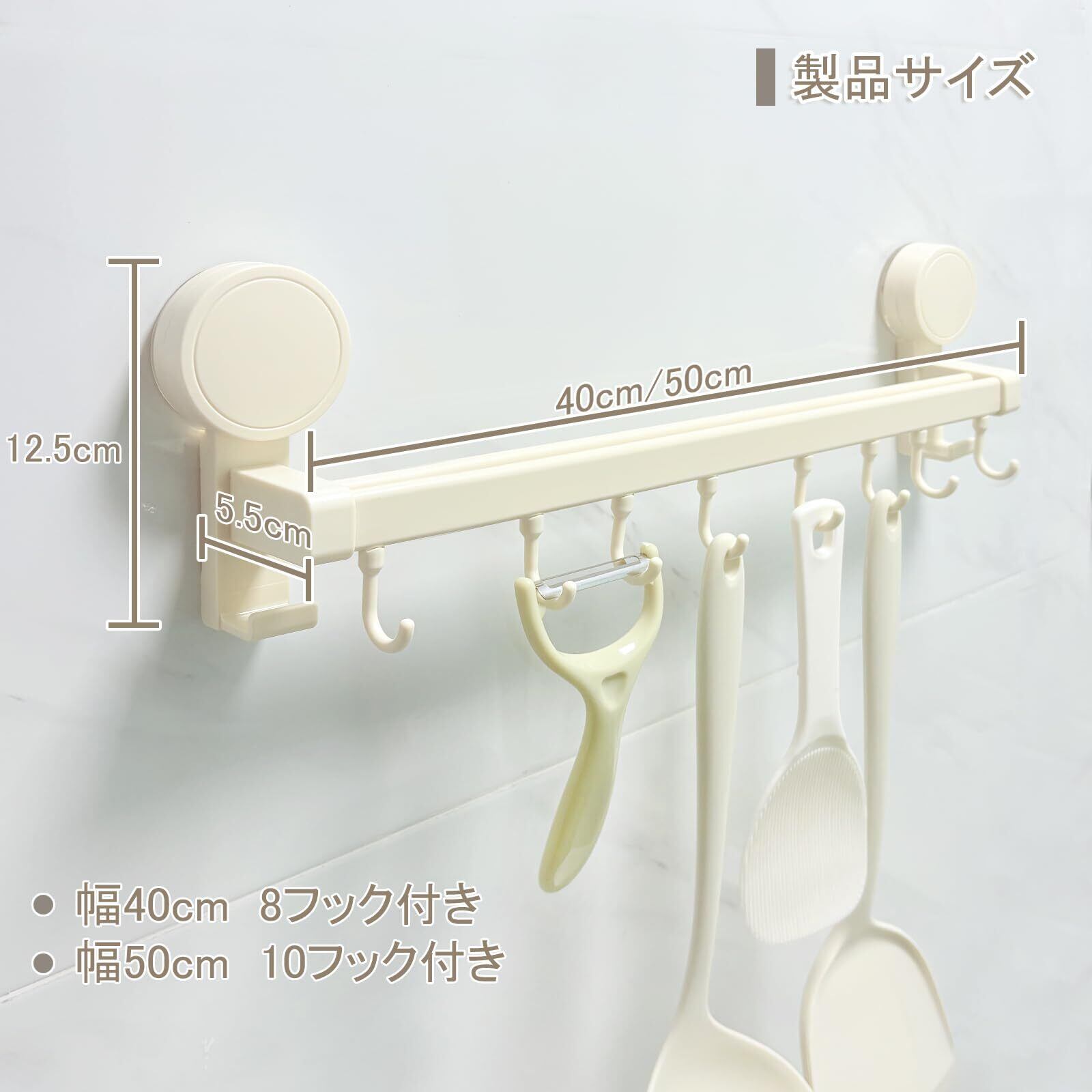 Mairearn キッチンツールフック 吸盤式 超強力 キッチンラック 防水防錆 耐荷重 ダブルバー設計 可動式フック キッチン収納 鍋蓋置き 調理器具収納 穴あけ不要 壁掛け 簡単取付 (乳白色 40cm 8個フック) | kki