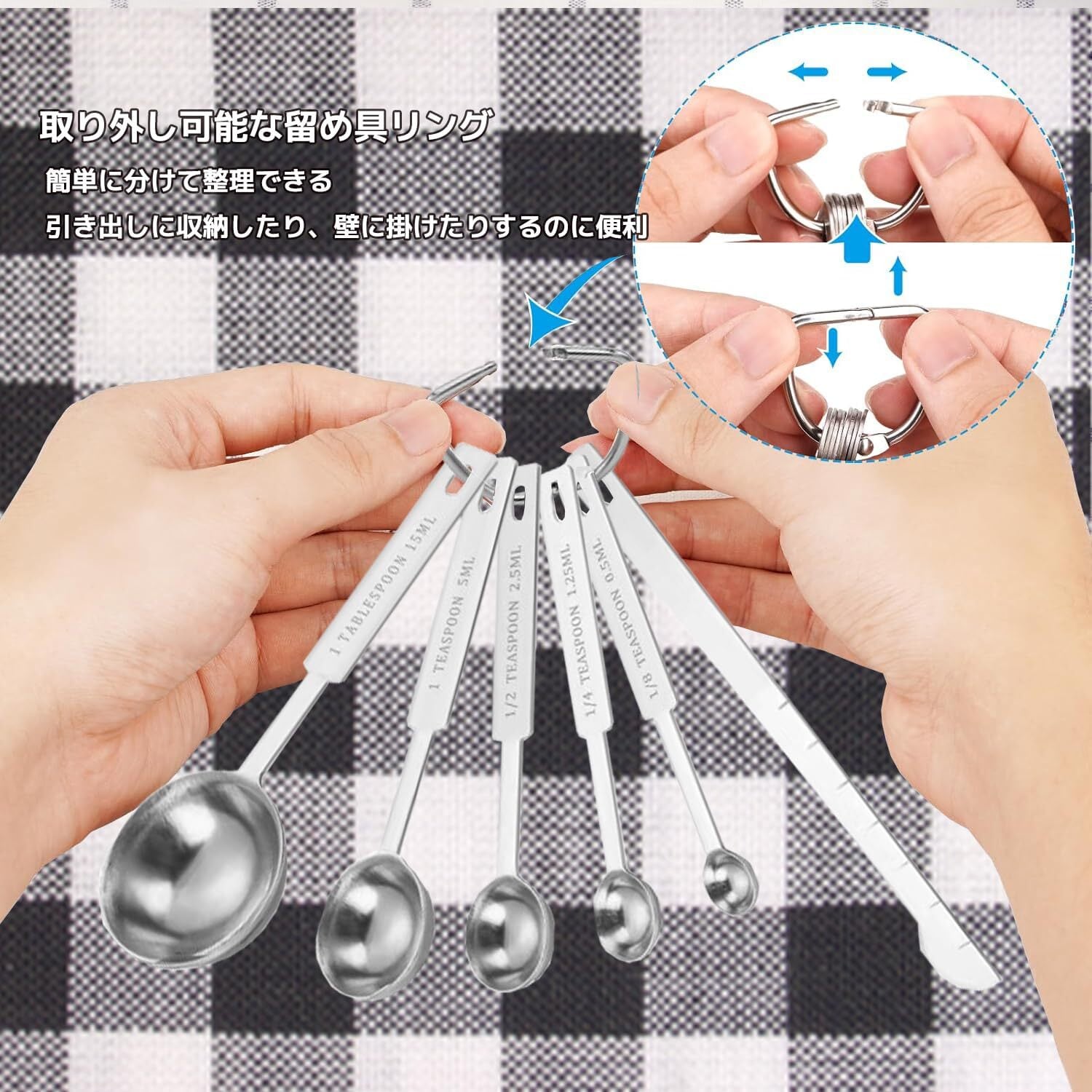 【素材】高品質なステンレスで製作されるので、錆びつきにくく、耐久性に優れ、高強度、耐熱性、耐腐食性、長期間利用可能になります。15ml(大さじ1)、5ml(小さじ1)、2.5ml(小さじ1/2)、1.25ml(小さじ1/4)、0.5ml(小さじ1/8)の5本計量スプーン+1本薄型ヘラ。機能とデザインを極限にまで追求しながらも本格的で調理しやすく料理を楽しくするシリーズ。