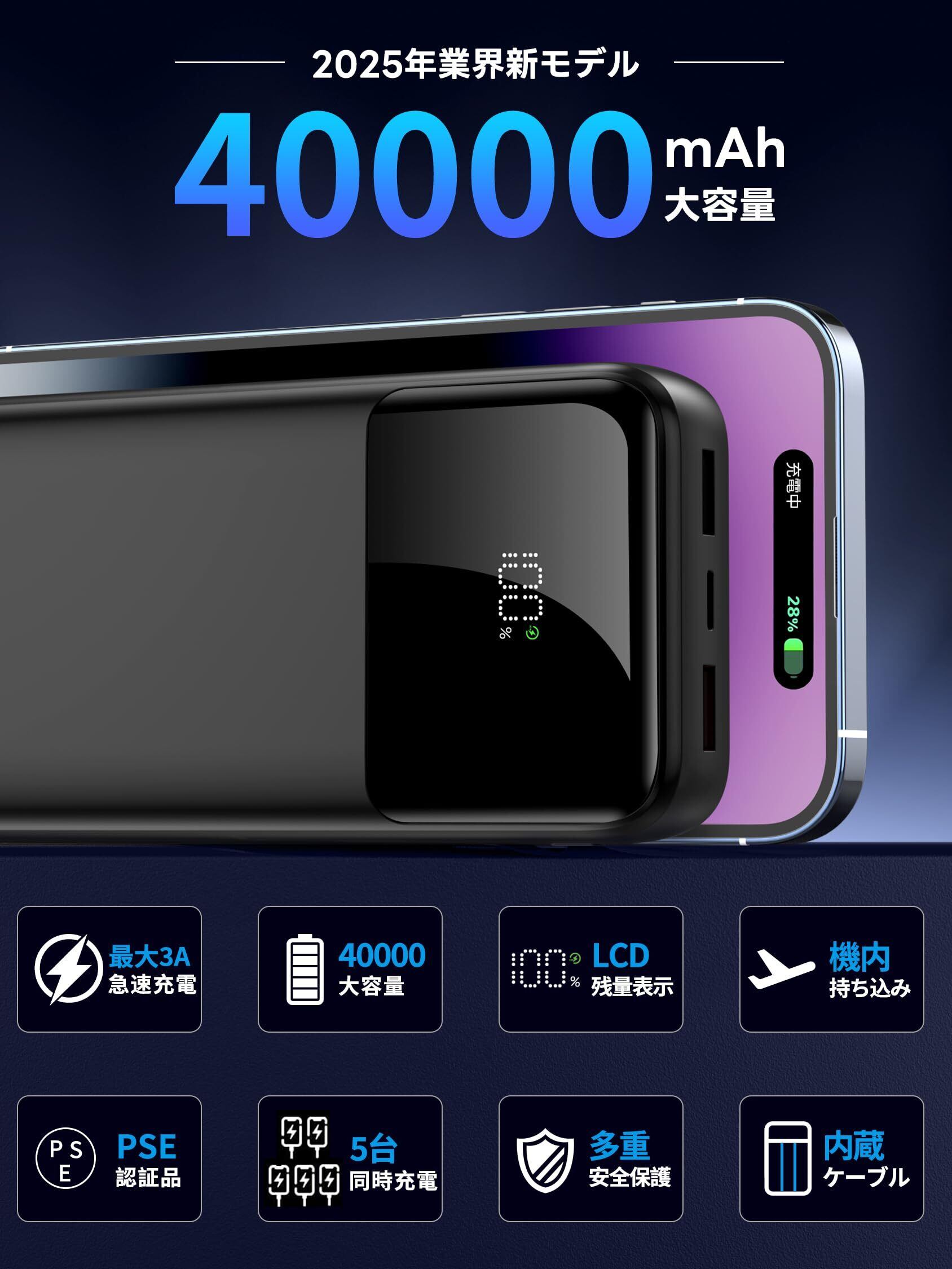 モバイルバッテリー 大容量【40000mAh・5台同時充電・22.5W急速充電】モバイルバッテリー 軽量 小型 スマホ充電器 携帯充電器 LCDディスプレイ残量表示 Type-C入出力兼用 2USB出力ポート 最大3A出力 PSE認証済 安全設計&回路保護 iOS/Android各種スマホ対応 アウトドア/キャンプ旅行/出張/停電対策/防災