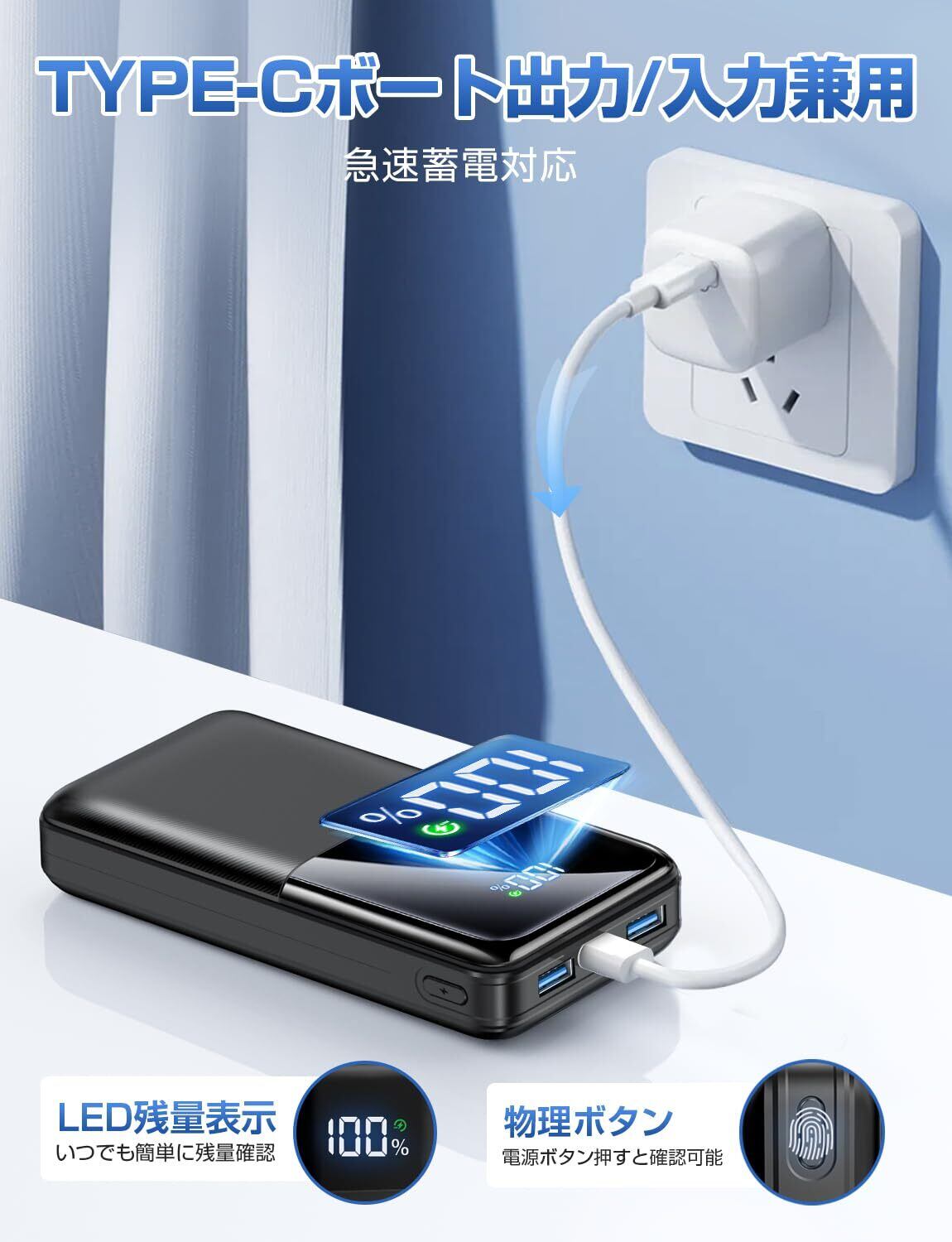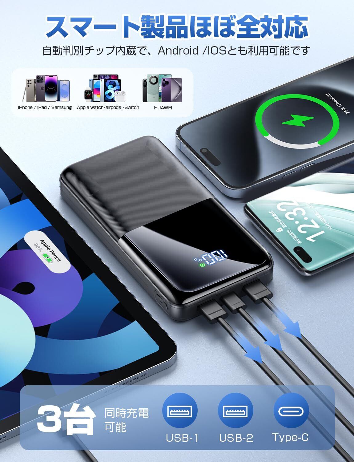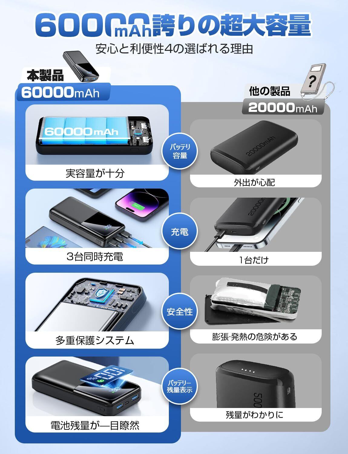 モバイルバッテリー 大容量【60000mAh大容量 & 3台同時充電】モバイルバッテリー 急速充電 最大2.4A出力 Type-C入出力兼用&USB-A出力ポートLEDディスプレイ残量表示 低電流対応 スマホ充電器 携帯充電器PSE認証済 マルチ安全回路保護 iPhone/iPad/Android各種スマホ対応 安心な大容量 アウトドア/旅行/出張/停電対策/防災 コンパクト 持ち運び便利