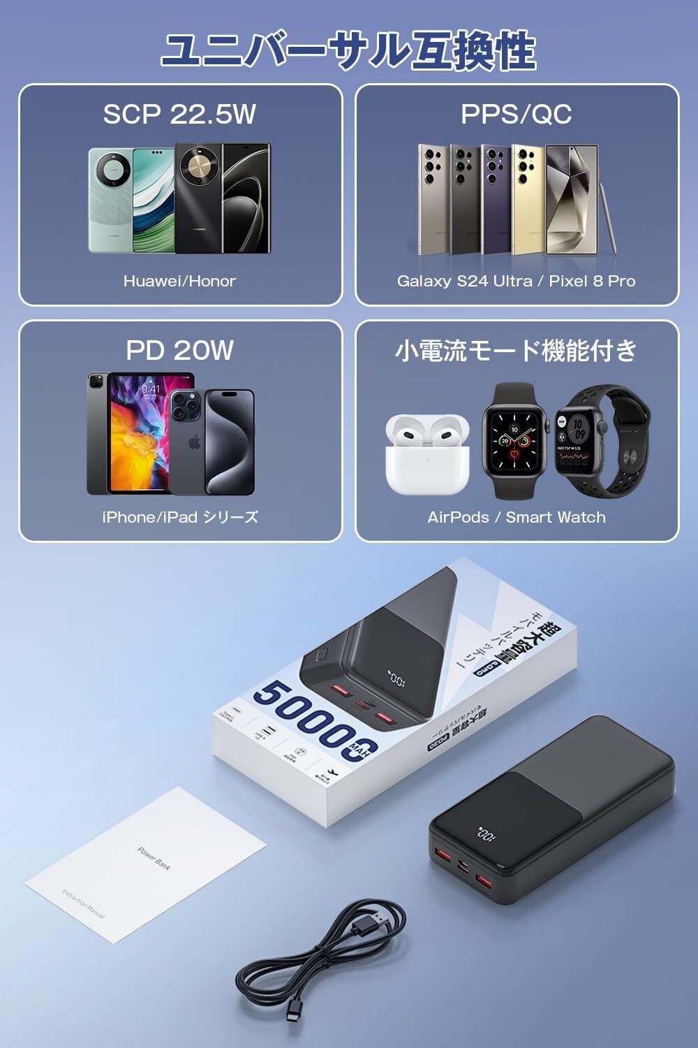 モバイルバッテリー 大容量【50000mAh・2025新登場】 22.5W/PD20W 急速充電 Type-C出入力 3台同時充電 携帯充電器 LED残量表示 iPhone/Android/iPad全機種対応 PSE認証済 iPhone16充電 器 旅行/出張/停電/地震/防災グッズ【災害時にも便利】