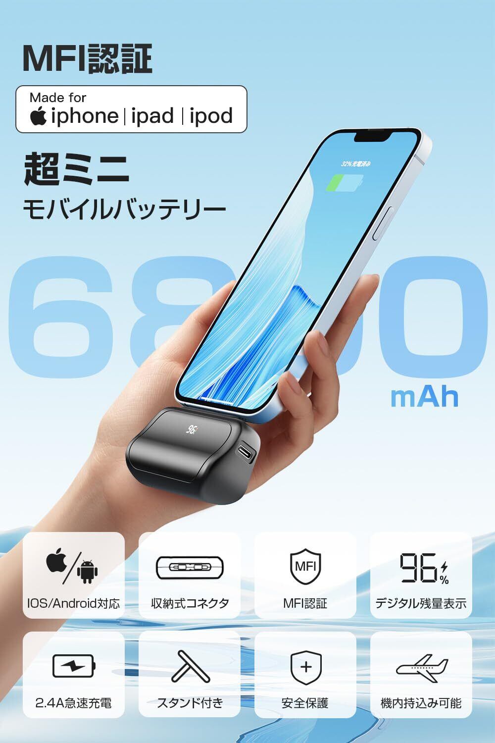 【新登場】 モバイルバッテリー 6800mAh 軽量 約100g 小型 MFi正規認証 Lightningコネクター & タイプCケーブル内蔵 Type-Cポート出入力 2台同時充電 携帯充電器 スマホ充電器 2.4A 急速充電 コードレス 機内持ち込み可 旅行/出張/アウトドア/停電対策/防災 iPad/iPhone/Android各種スマホ対応PSE技術基準適合 (ホワイト)