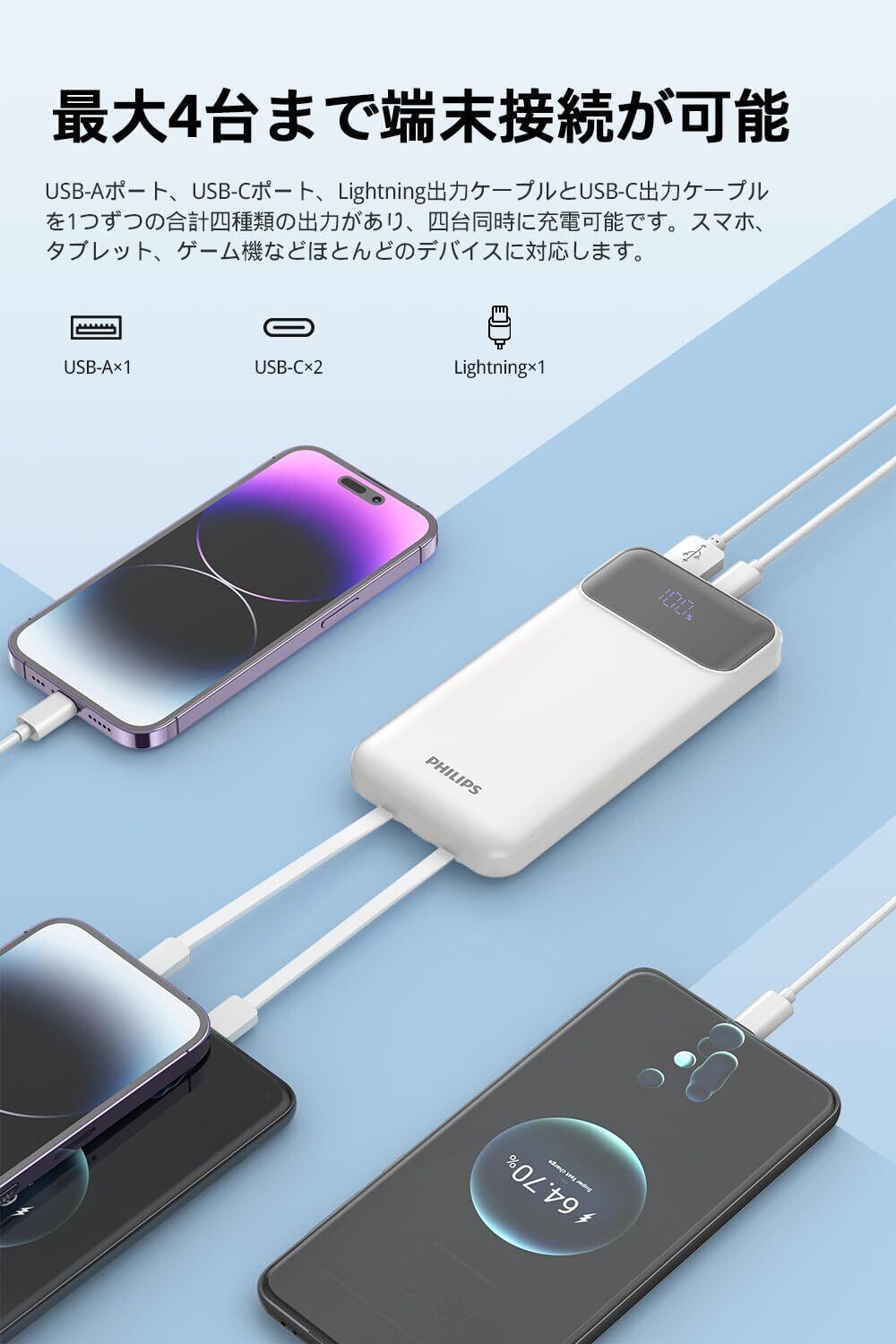 Philips (フィリップス) モバイルバッテリー 10000mAh大容量 ケーブル内蔵 PD&QC急速充電 四台同時充電 LED電量表示 スマホ充電器 PSE認証済 多種保護 持ち運びやすい DLP1912CW