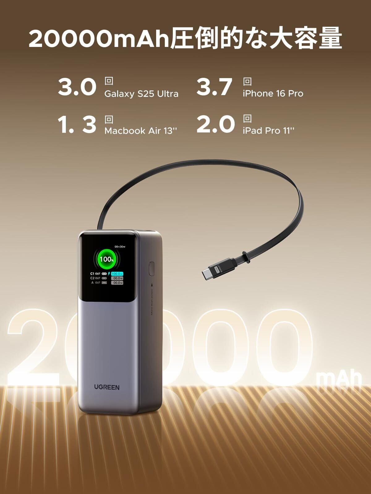UGREEN Nexode 巻取式USB-Cケーブル内蔵 モバイルバッテリー (20000mAh・165W) ノートPCにも急速充電対応 PD・PPS 5A仕様対応 TFTディスプレイ搭載 パススルー/低電流モード PSE技術基準適合 MacBook PD対応Windows PC iPad iPhone Galaxy Android スマホ ノートPC対応 PB726