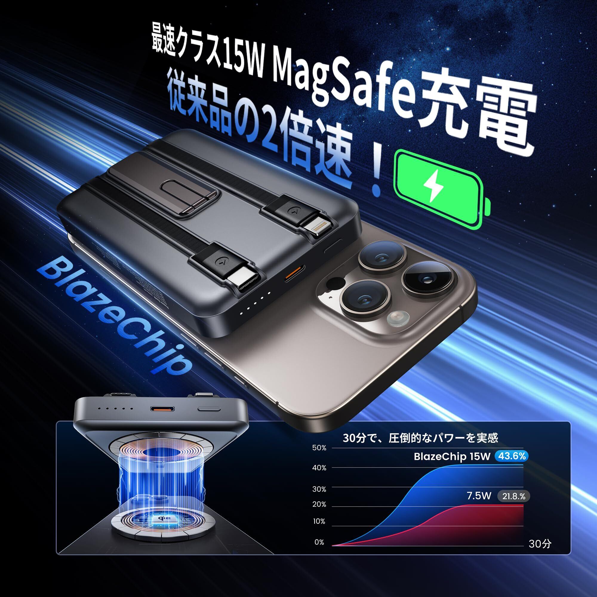 【最大15Wワイヤレス急速充電・MagSafe対応・超強磁力】たったの7.5W出力の「なんちゃって急速充電」とは一線を画す、最大15W出力の本格ワイヤレス充電を搭載。MagSafe対応でiPhone 12〜16シリーズにピタッと吸着、わざわざケーブルを探す手間もゼロ。磁力は非常に強く、バッテリーだけを持ってもスマホが落ちないほどの吸着力を実現。※MagSafe非対応ケースをご使用の場合、磁力が弱くなる可能性があります。