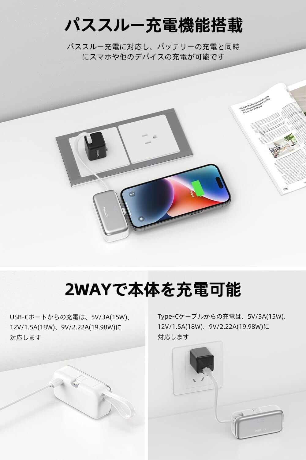 Philips (フィリップス) モバイルバッテリー 小型 直差し コードレス 4900mAh 折畳み式 Lightning コネクター type-c ケーブル内蔵 軽量 モバイル充電器 タイプc ライトニング 3台同時充電/パススルー機能/LEDディスプレイ iOS & Android デバイス対応 PSE認証済 ホワイト DLP2558VW | kki
