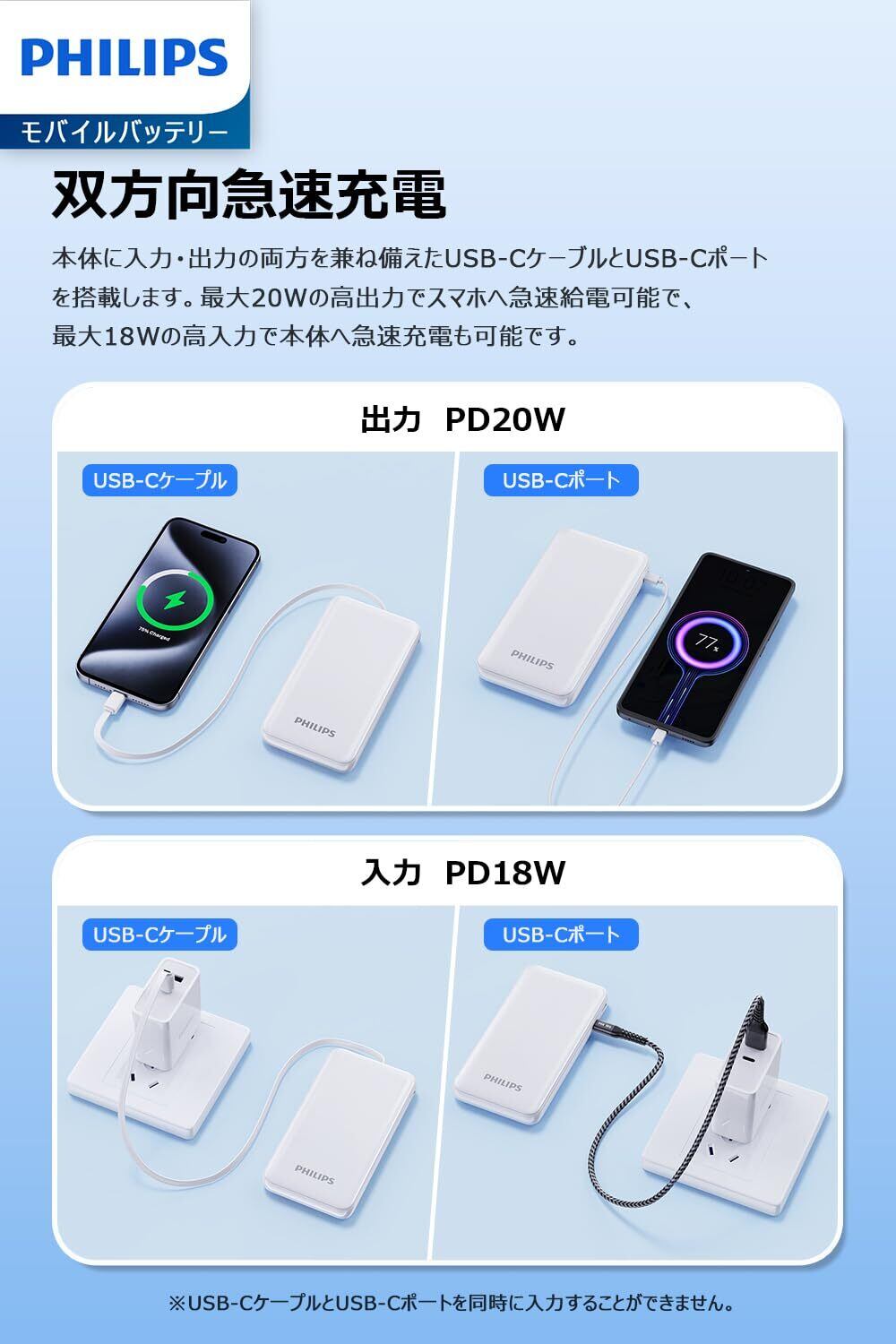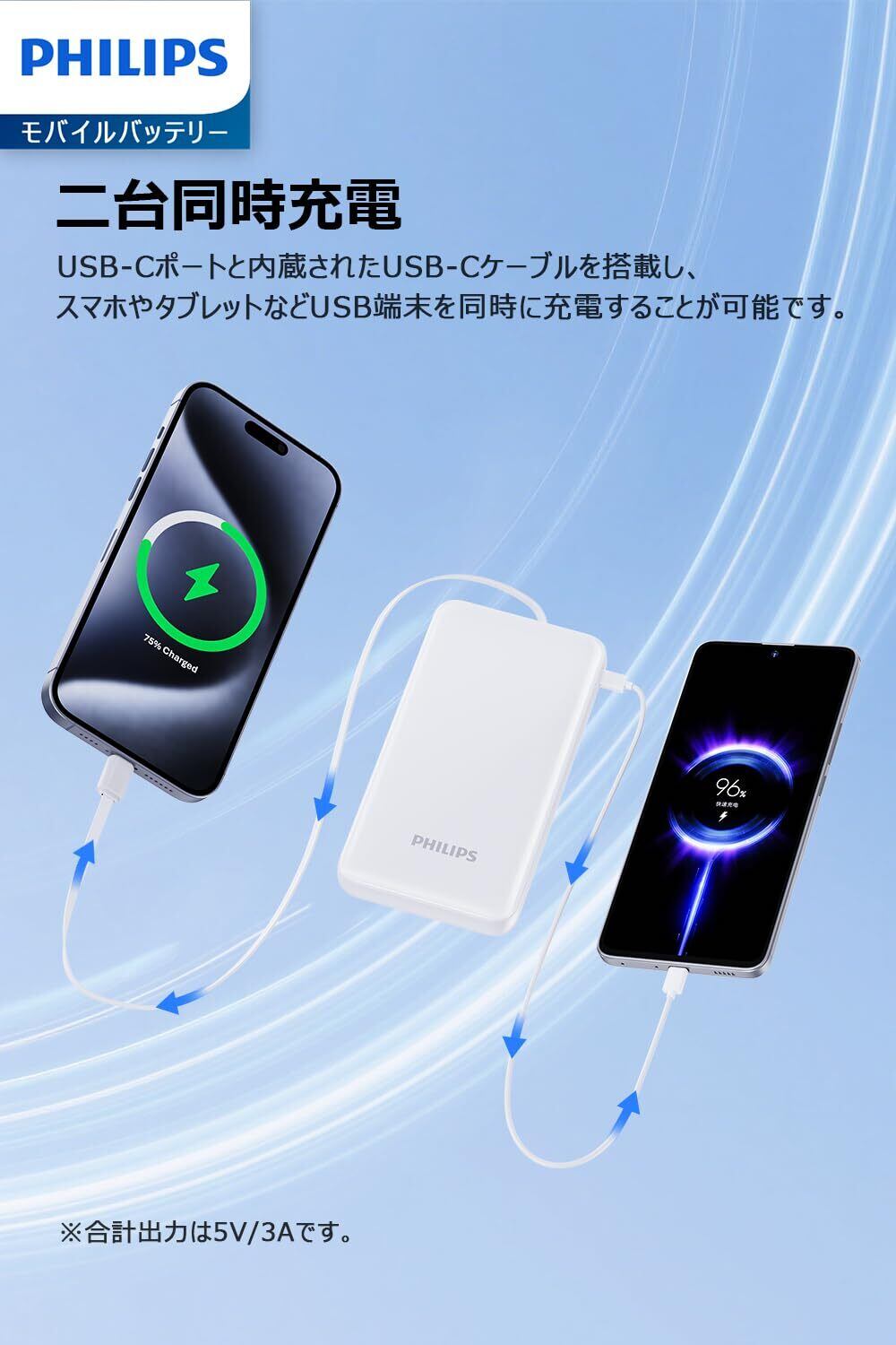 Philips (フィリップス) モバイルバッテリー 10000mAh大容量 巻き取り式USB-Cケーブル PD20W急速充電 出力入力対応 二台同時充電 パススルー充電 スマホ充電器 PSE認証済 多種保護 持ち運びやすい DLP1913C (ホワイト)