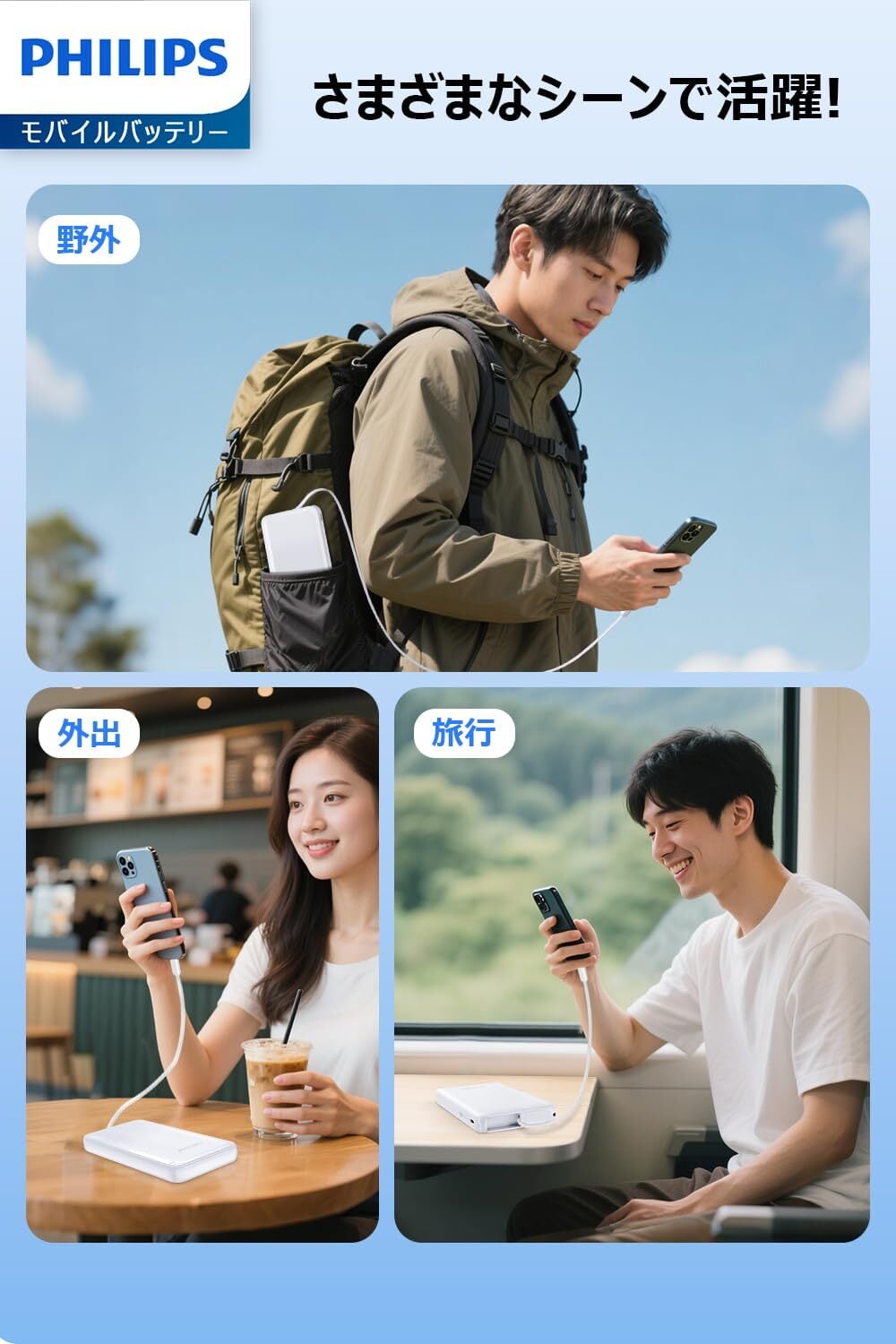 Philips (フィリップス) モバイルバッテリー 10000mAh大容量 巻き取り式USB-Cケーブル PD20W急速充電 出力入力対応 二台同時充電 パススルー充電 スマホ充電器 PSE認証済 多種保護 持ち運びやすい DLP1913C (ホワイト) | kki