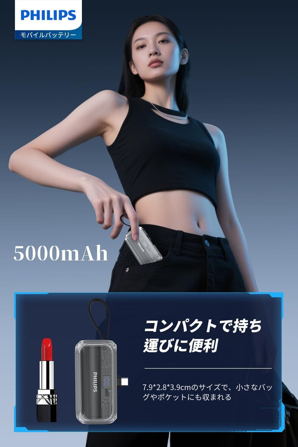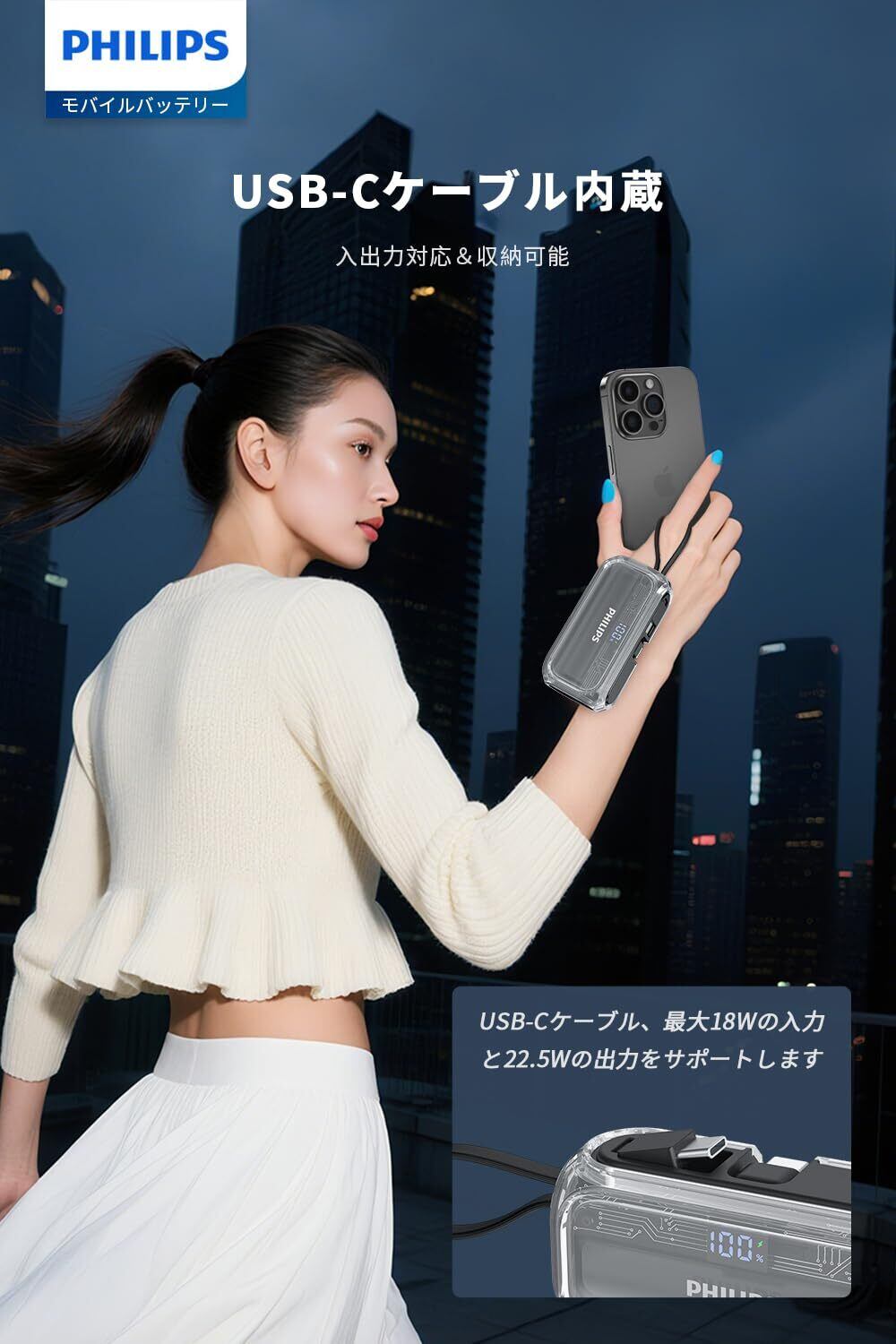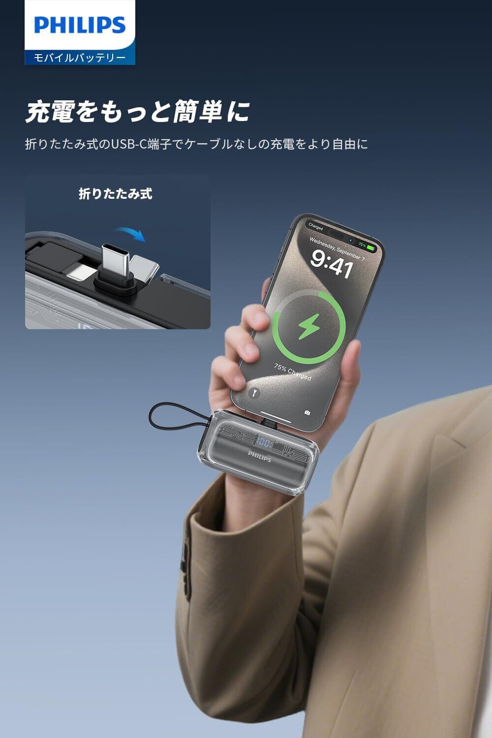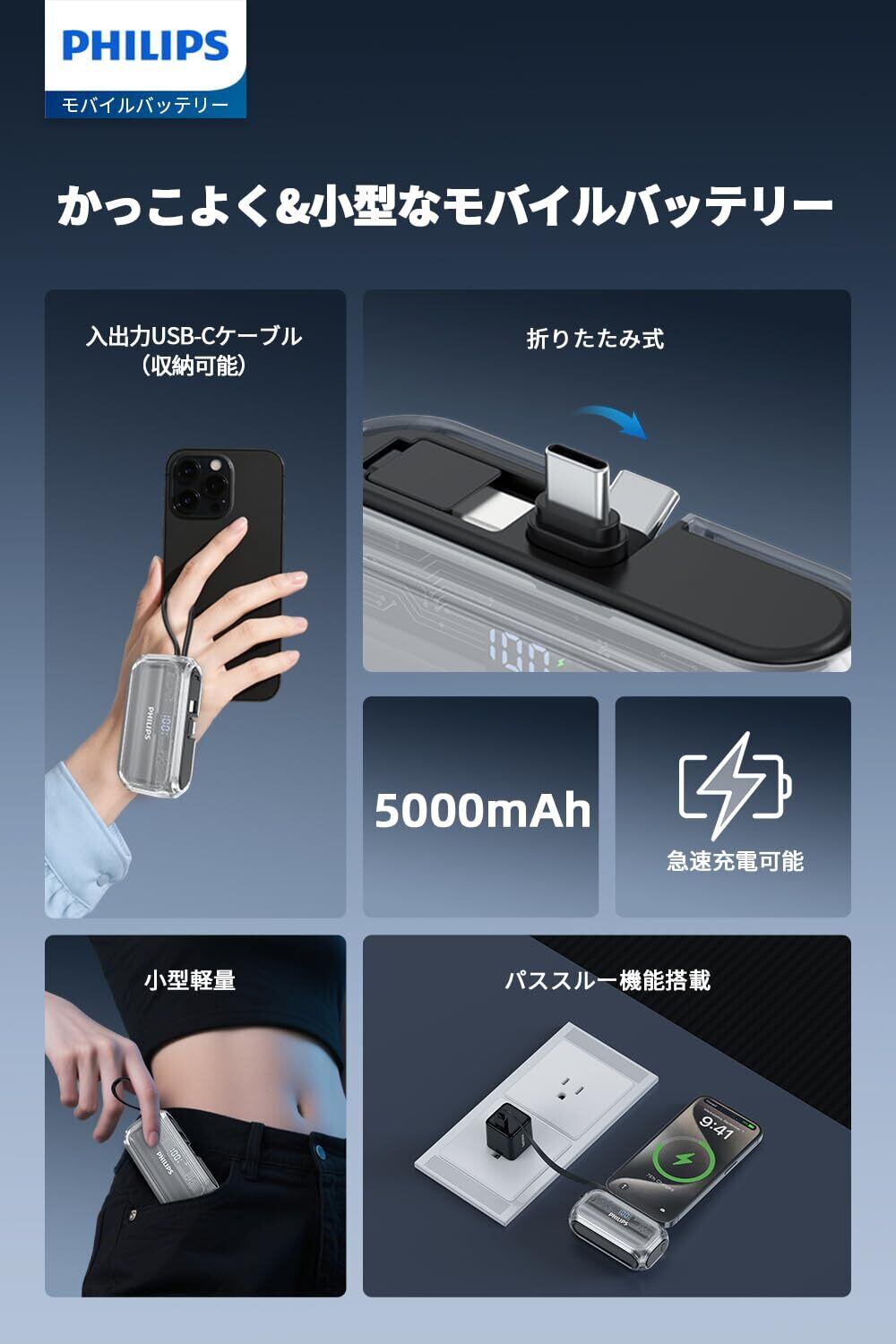 Philips (フィリップス) モバイルバッテリー 5000mAh 小型 USB-Cコネクター USB-Cケーブル内蔵 軽量 直差し コードレス 大容量 二台同時充電 モバイル充電器 パススルー機能 PSE認証済 タイプc デバイス対応 DLP2568C (ブラック)