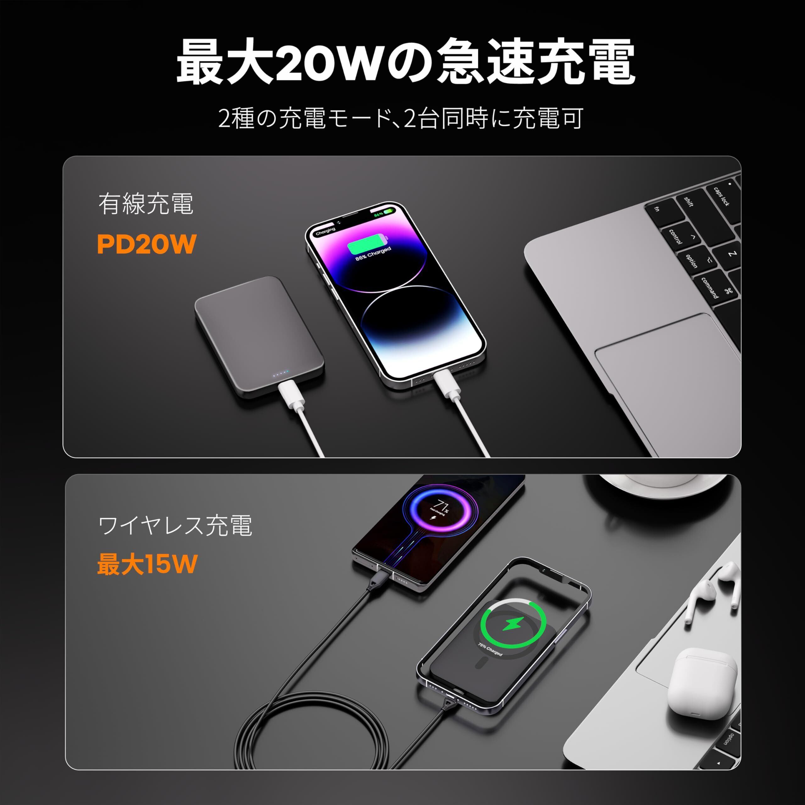 【業界初のチタン金属・0.8cmの超薄型】Yamisan モバイルバッテリー Magsafe対応 小型 軽量 PD20W急速充電 マグネット式 ワイヤレス充電器 スマホ充電器 両台同時充電 Type-C入出力兼用 5000mAh マグセーフ充電器 iPhone16/15/14/13/12シリーズ対応 コンパクトで機内持ち込み可 旅行/出張/災害用 PSE認証済み(チタン灰色)