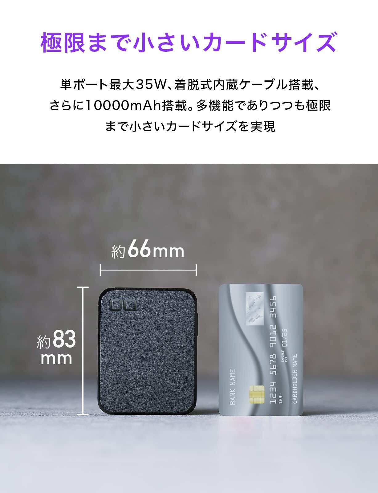 【小型&軽量 世界最小級サイズ】もっと持ち物をシンプルに、使いやすさにこだわったSMARTCOBYシリーズを作りたい!そんな思いの中CIOの人気モバイルバッテリーであるSMARTCOBY Proの持つ小型化と高出力化のテクノロジーを駆使した全く新しいモバイルバッテリーが登場。SMARTCOBY Pro CABLEは30W出力対応の10000mAhモバイルバッテリーの中で世界最小級を実現。重量も200gを切っている為、持ち運びも楽々。カードサイズながら10000mAhを搭載しているので、iPhoneを約1.5回以上、iPad(Lightning対応モデルに限る)も約0.5回以上の充電可能です。