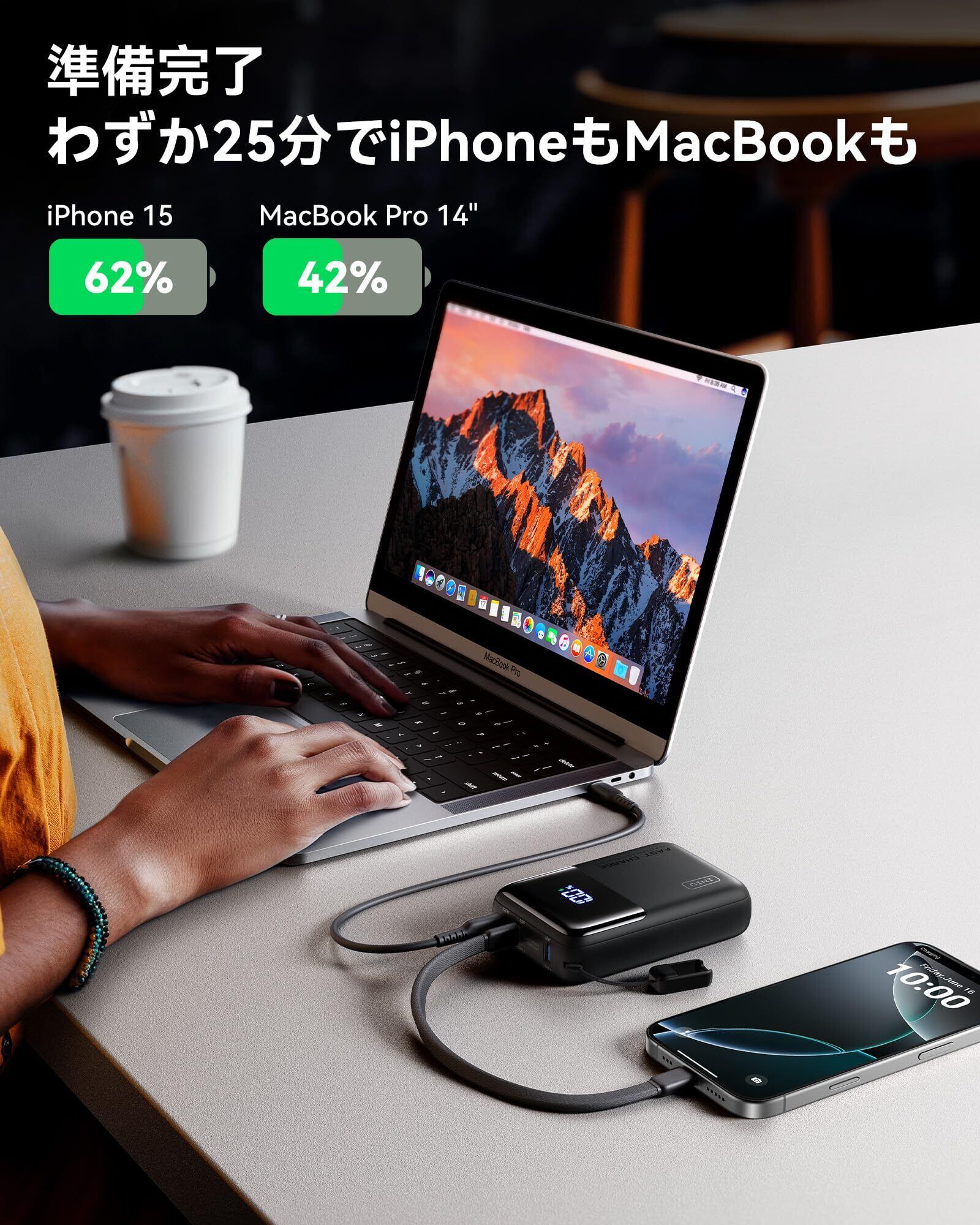 【25分でiPhoneとMacBookを急速充電】2台同時に最大110Wの高速充電。25分でMacBook Pro 14"を42%、iPhone 15を62%充電。