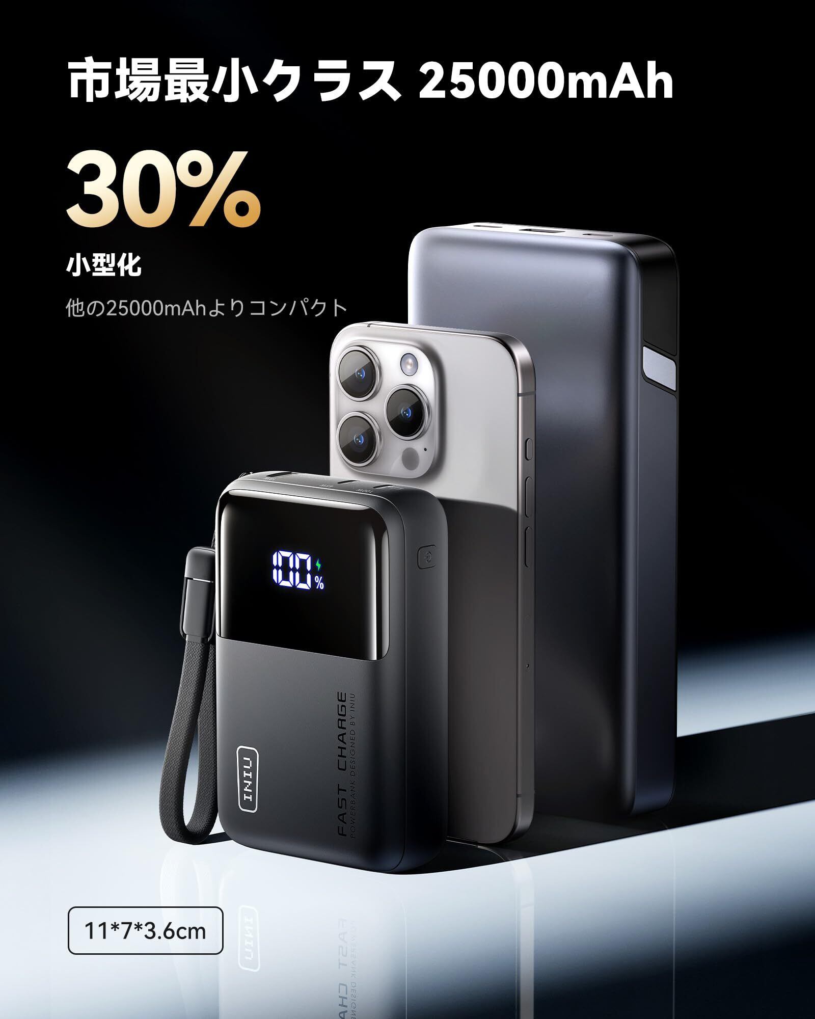 INIU P63 モバイルバッテリー 100W 大容量 25000mAh 超コンパクトサイズ 急速充電【USB-C入出力ポート PSE認証済 3台同時充電】ストラップ式USB Cケーブル付きモバイル・バッテリー ノートPC・タブレット・スマホ用 機内持ち込み可能 アウトドア/防災/緊急用の必携品 MacBook iPhone 16 / 15 & Android iPad その他各種対応【ブラック】