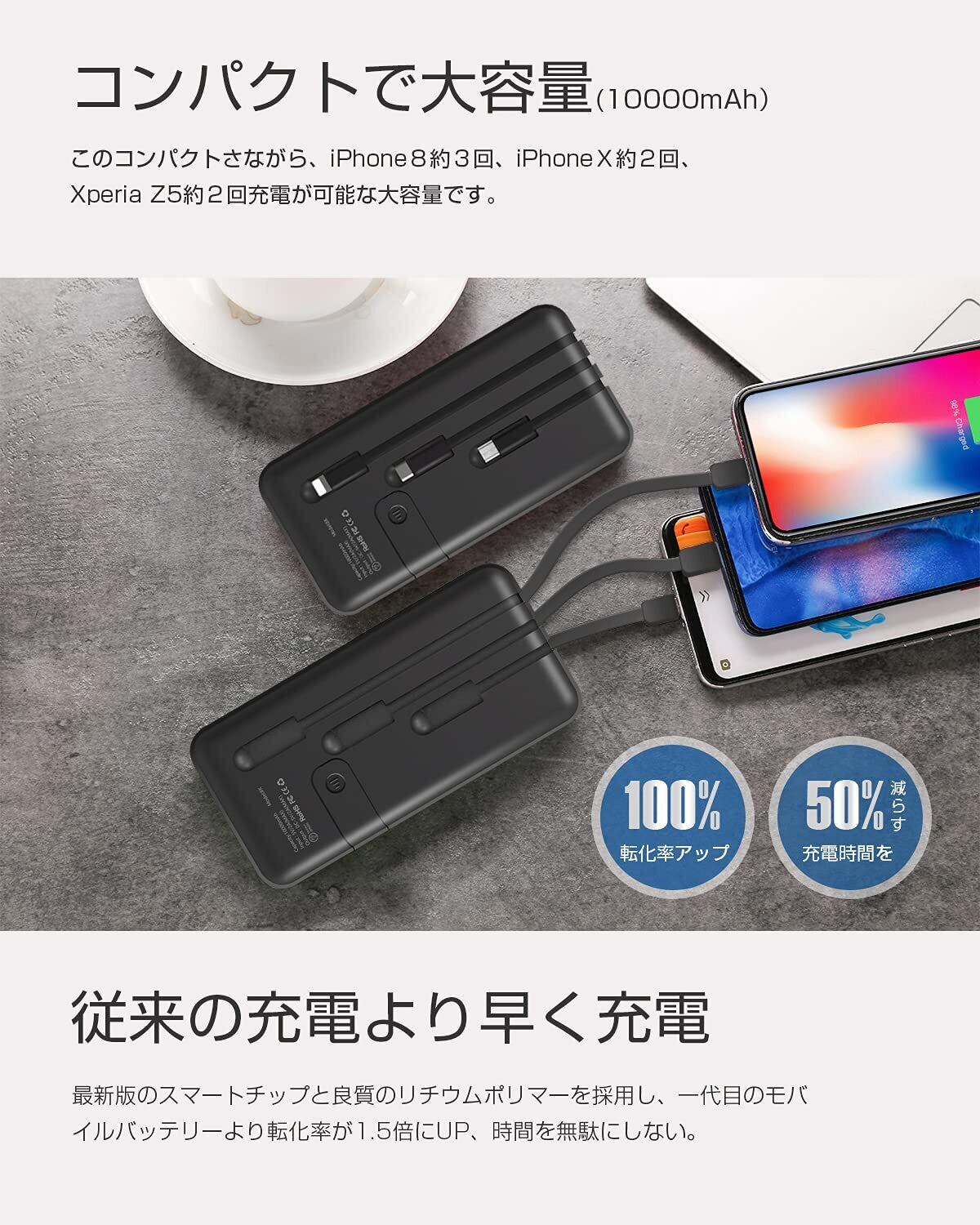 軽量 薄型 新版 モバイルバッテリー 10000mAh 大容量 3ケーブル内蔵(Lightning+Micro USB+Type-Cケーブル内蔵) 1USBポート 4台同時充電でき 急速充電 バッテリー スマホ充電器 携帯 持ち運び便利 残量表示 スタンド機能搭載 PSE認証済 iPhone/iPad/Android対応