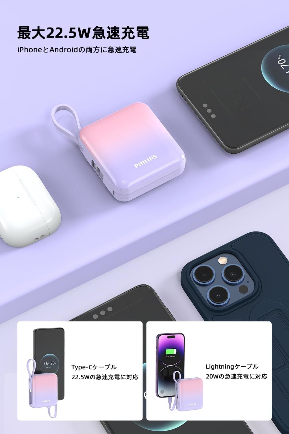 Philips (フィリップス) モバイルバッテリー 10000mAh 大容量 小型 携帯充電器 Lightning type-c ケーブル内蔵 22.5W タイプc ライトニング 4台同時充電 スマホ 持ち運び iPhone 16 / 15 Android iPad 各種機器対応 PSE認証済 (ピンク紫)