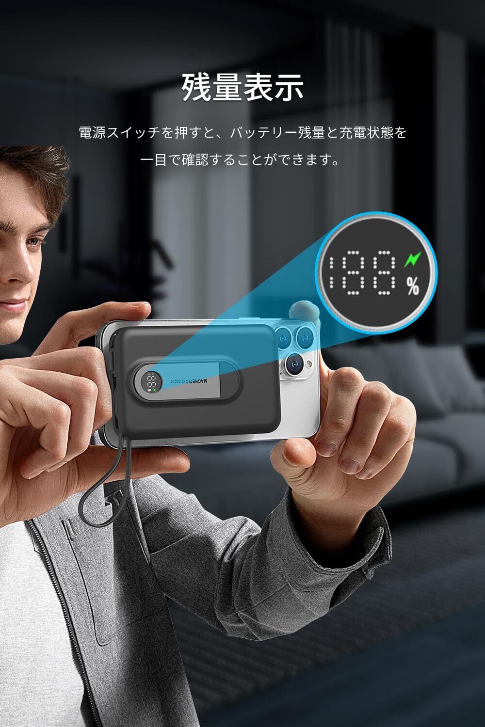 【10000mAh大容量&マグネット式ワイヤレス充電】10000mAhの大容量で多数の端末に2回ぐらいの充電を実現します。i.Phoneにマグネットで取り付けて簡単にワイヤレス充電ができます。充電しながらスマホを操作しやすくて便利です。また、ワイヤレス最大15W出力、充電を待つ無駄な時間を減らすことが期待されます。磁力も強めでスマホがずれる心配もありません。※他のスマートフォンをご利用の場合は、MagSafe対応のケースを使用してください。非対応のケースでは磁石の効果がないので充電できません。
