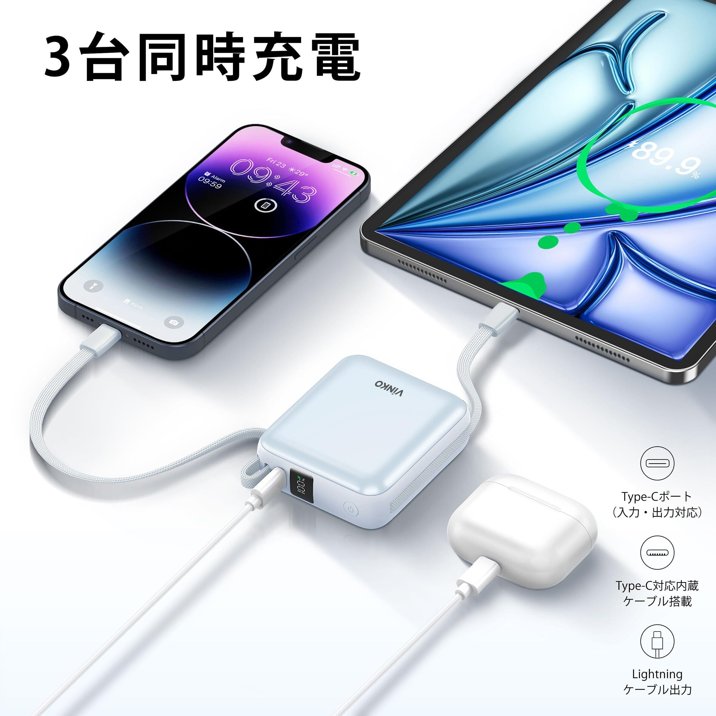 VINKO モバイルバッテリー 10000mAh 大容量 軽量 小型 -スマホバッテリー 急速充電 Lightning type-c ケーブル内蔵 -携帯充電器 PD 22.5W 3台同時充電 スマホ 持ち運び iPhone 16 / 15 Android iPad 各種機器対応 コンパクト&軽量 機内持ち込み可能 旅行/出張/アウトドア/停電対策/防災 PSE認証済 (水色) | kki