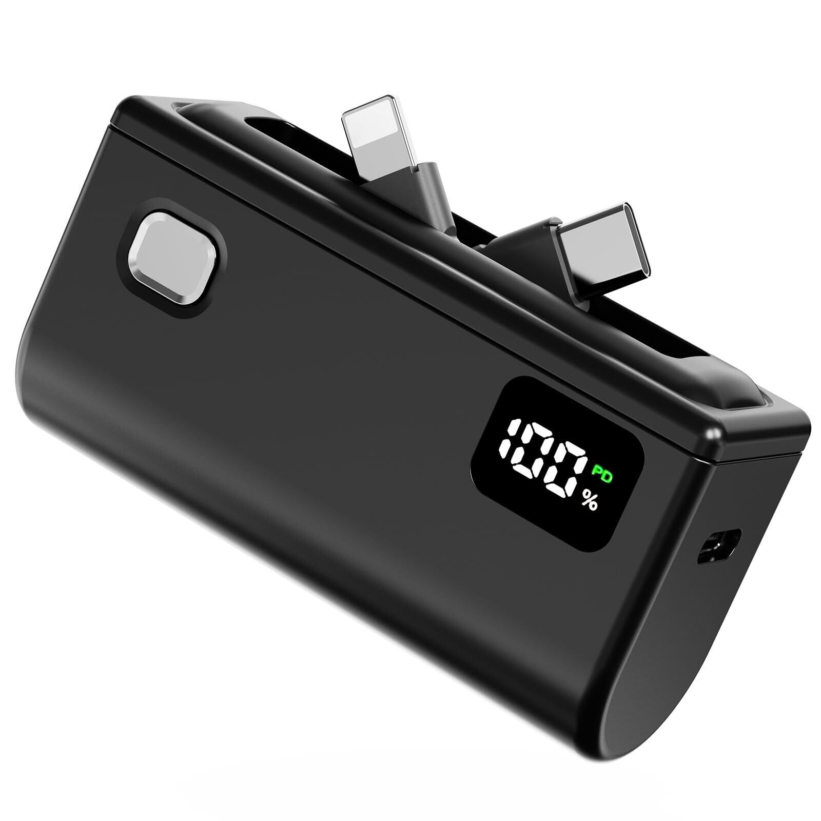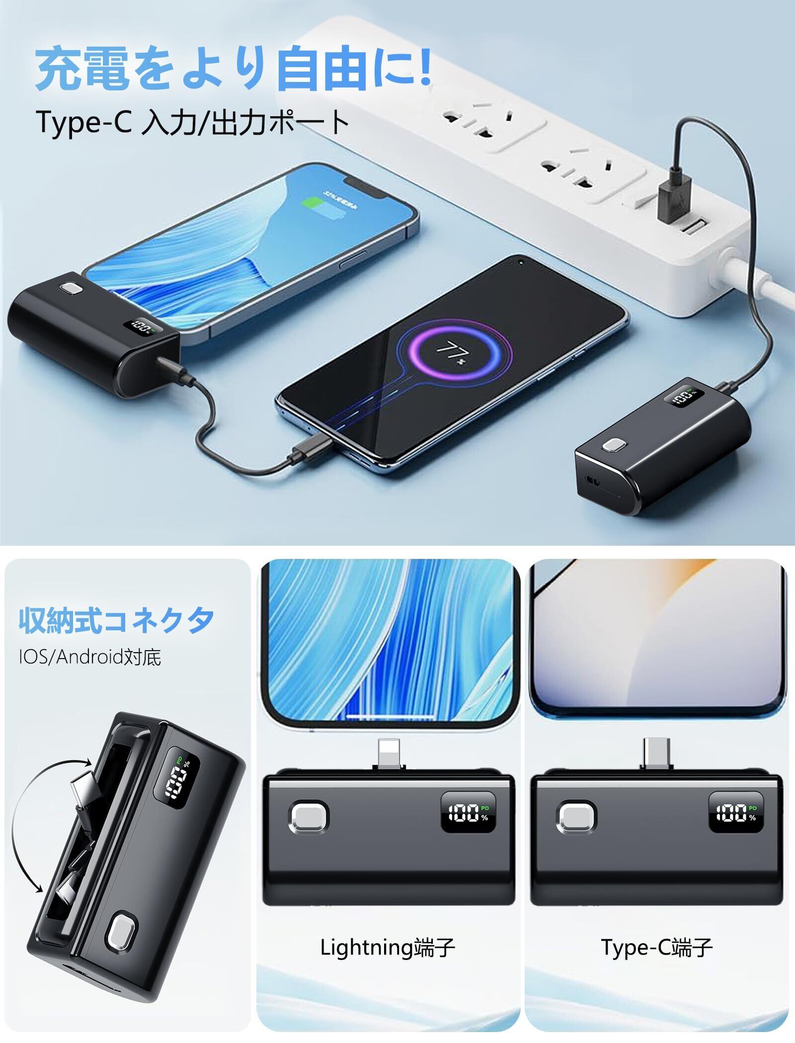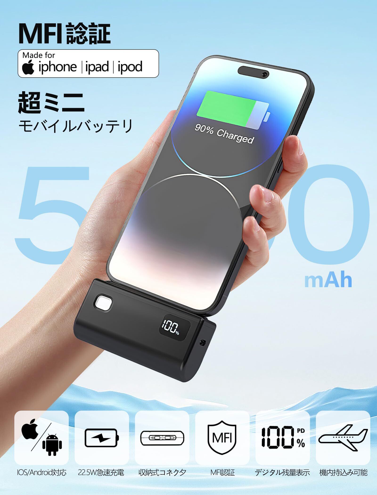 【2025業界初登場&22.5W急速充電】 モバイルバッテリー 超小型 大容量 5000mAh MFi正規認証 (Lightningコネクター & タイプCコネクター内蔵) LED残量表示 スマホ充電器 急速充電 携帯充電器 PSE認証済 コンパクト 持ち運び便利 スタンド搭載 機内持ち込み可能 旅行/出張/アウトドア/停電対策/防災 iPad/iPhone/Android各種スマホ対応(黒)