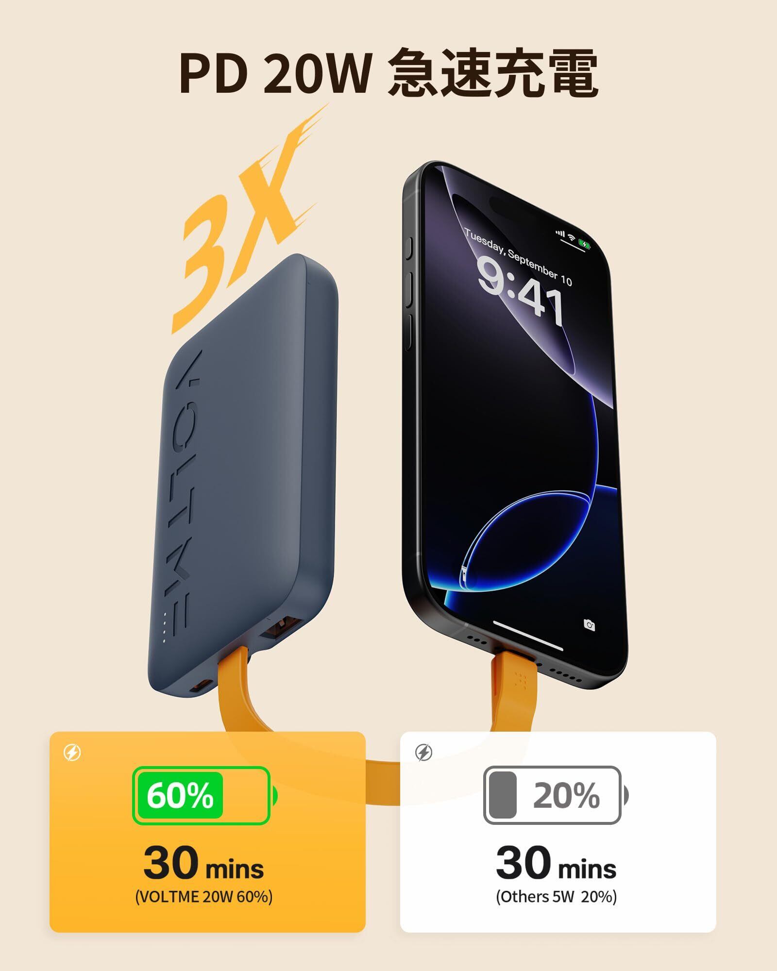VOLTME モバイルバッテリー ケーブル内蔵 薄型 22.5W 10000mAh 大容量 モバイル・バッテリー 三台同時充電可能 Type-C×2 + Type-A タイプc PD 急速充電 携帯バッテリー スマホ充電器 PD3.0& QC3.0 PPS対応 PSE技術基準適合 iPhone iPad Android 各種対応 (ダークブルー)