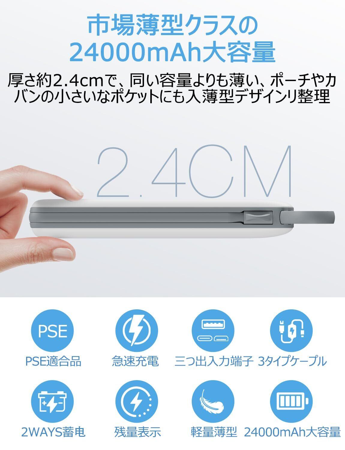 モバイルバッテリー 【2025新登場&出入力ケーブル内蔵】 24000mAh大容量 薄型 3台充電 スマホ充電器 携帯充電器 携帯バッテリー 急速充電 パススルー充電可能 ケーブル着脱可能 コンパクト 持ち運び便利 残量表示 防災グッズ 日本説明書付き タイプC/ライトニング/USB Micro充電対応 旅行 出張/アウトドア/キャンプ PSE認証済