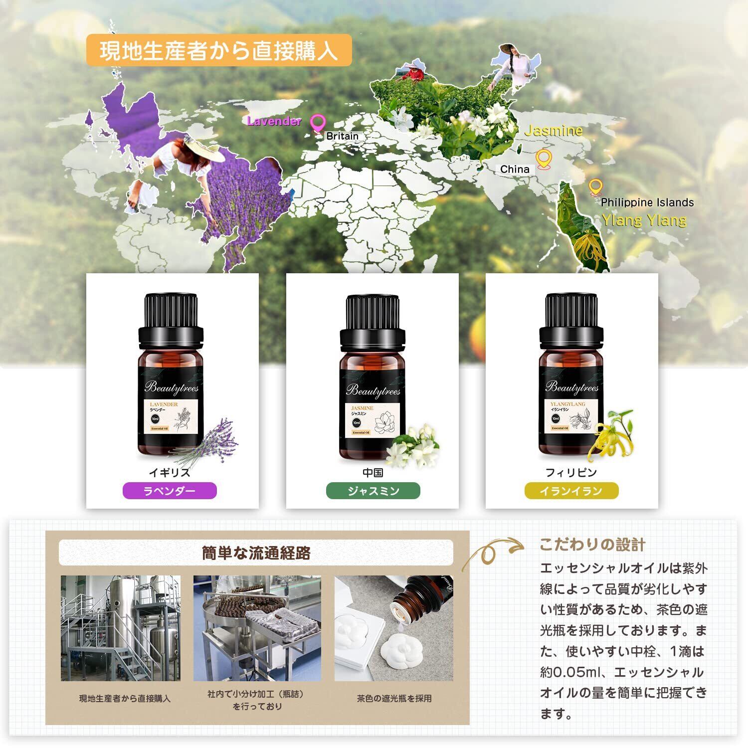 Beautytrees アロマオイル セット 10mlx3本 フローラル系 エッセンシャルオイル 精油 天然素材 自然な香り ラベンダー/ジャスミン/イランイラン アロマ ディフューザー用 アロマストーン用 マッサージ用 お風呂に 加湿器用 プレゼント