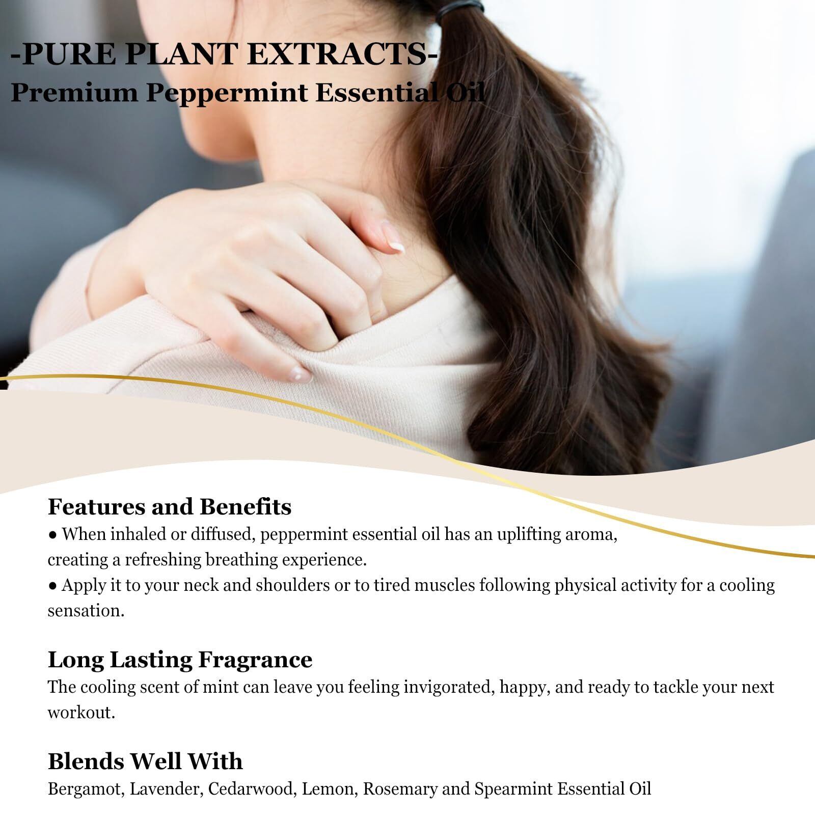 「ペパーミントオイル」:このペパーミントエッセンシャルオイルは爽やかな香りで、気分を高揚、心をリフレッシュさせるのに最適です。