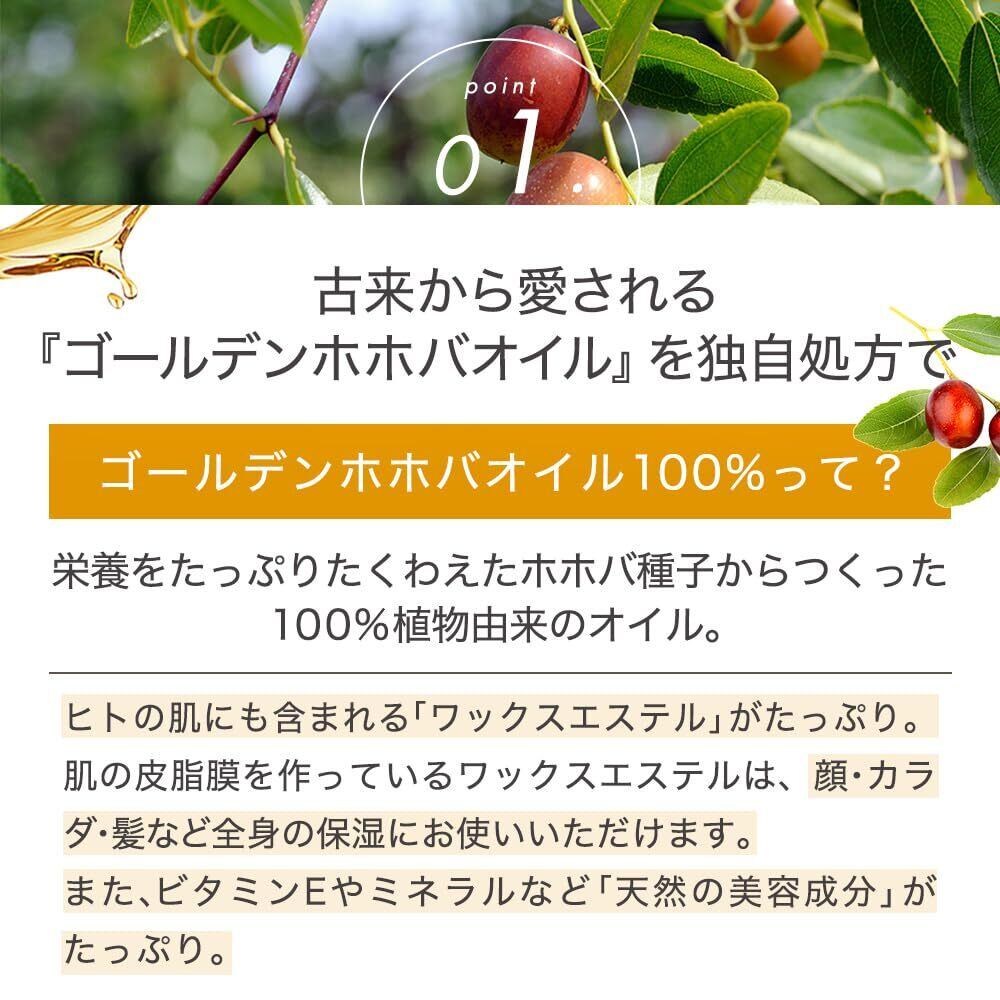 【ゴールデンホホバオイルとは】 非加熱で精製され、貴重な成分や栄養素が全て残ったオイルです。栄養をたっぷり含んでおり、特にビタミンEが豊富。肌の潤いと柔軟性を保ち、きちんと保湿。