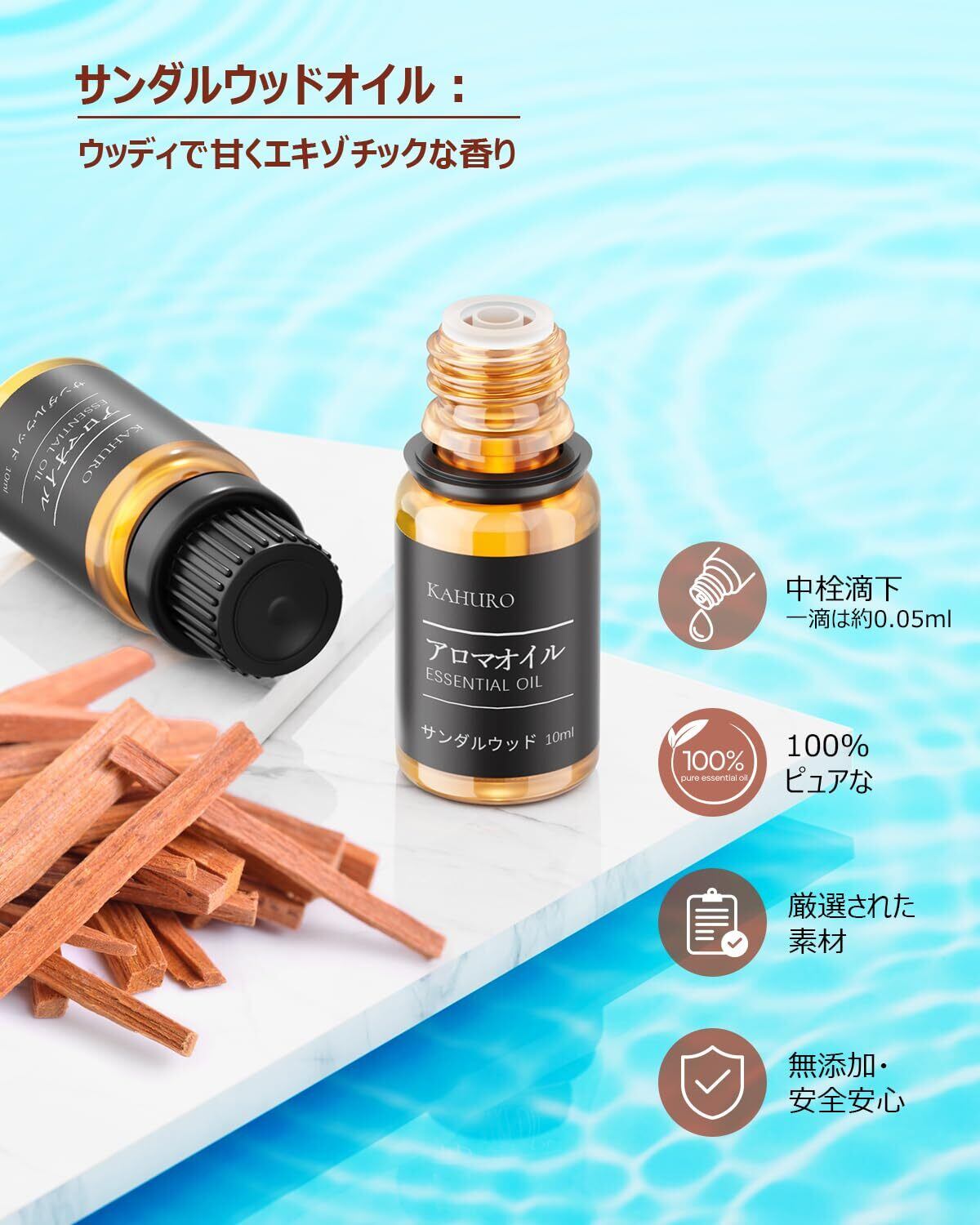 Kahuro サンダルウッド 精油 10ml エッセシャンオイル 純天然抽出 白檀 アロマオイル ナチュラル アロマディフューザー用 加湿器用 樹木系 Sandalwood Essential Oil