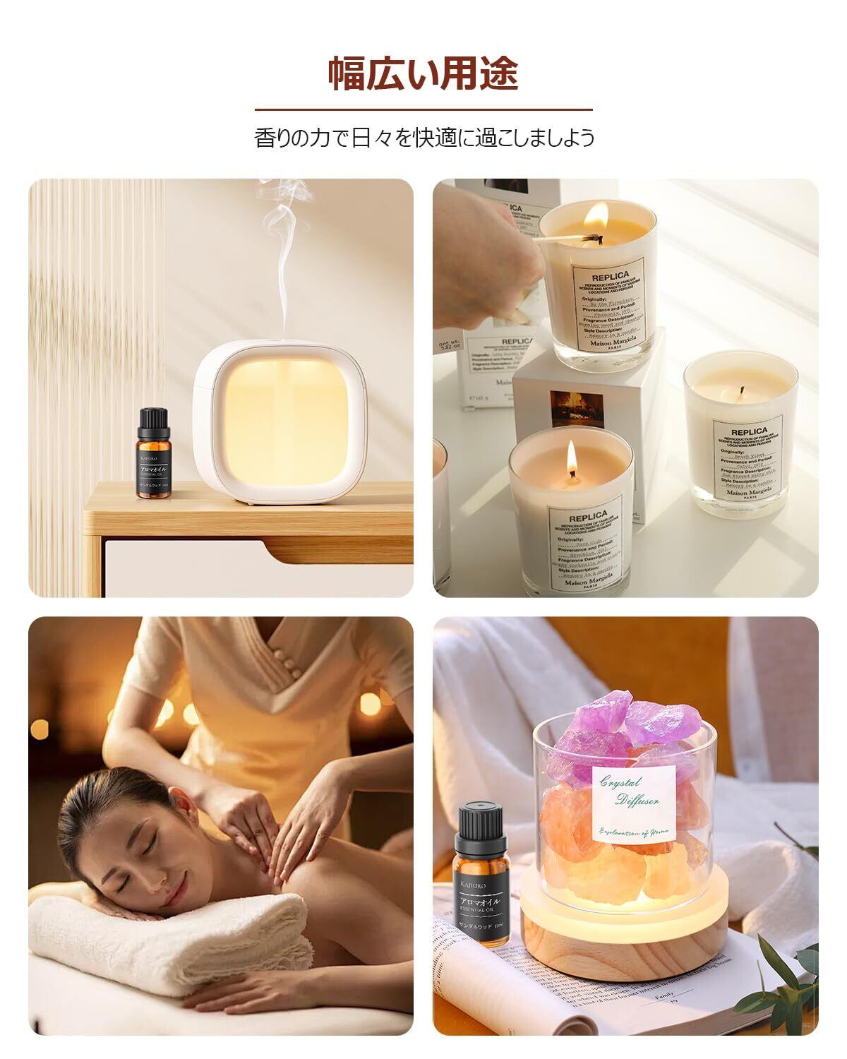 【多用途】おすすめの使い方:●リラックスしたい時●安眠したい時●.気持ちを落ち着かせたい時。アロマストーンやディフューザーなどを使って、サンダルウッドの香りで、お部屋の中に漂ったニオイが抑えられ、リラックスできる空間になります。アロマ初心者からよくエッセンシャルオイルを使用している専門家までオススメの精油です。